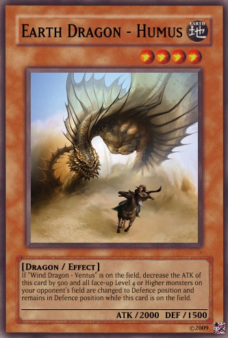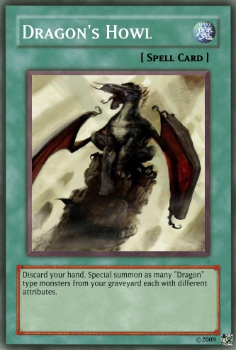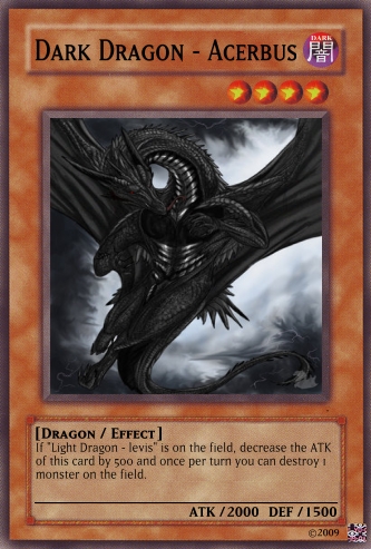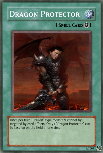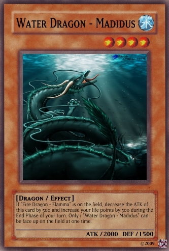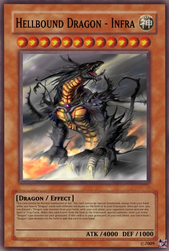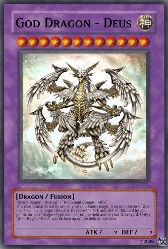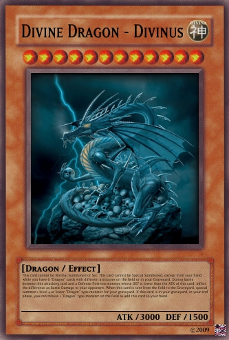 Jesterz Posted March 26, 2009 Report Share Posted March 26, 2009 My frist good looking deck.Please tell my if any need improving.Activate only when an opponent's monster declares an attack against a "Dragon" type monster. Negate the attack then either destroy all Attack Position monsters your opponent controls or inflict damage to your opponent equal of the attacking monster's ATK. If "Dark Dragon - Acerbus" is on the field, decrease the ATK of this card by 500 and once per turn you can destroy 1 card on the field. Only 1 “Light Dragon - Levis" can be face up on the field at one time. If "Water Dragon - Madidus" is on the field, decrease the ATK of this card by 500 and inflict 500 damage to your opponent during the End Phase of each of your turns. Only 1 “Fire Dragon - Flamma" can be face up on the field at one time. If "Wind Dragon - Ventus" is on the field, decrease the ATK of this card by 500 and all face-up Level 4 or higher monsters on your opponent's field are changed to Defence position and remains in Defence position while this card is on the field. Only 1 “Earth Dragon - Humus" can be face up on the field at one time. Send, from your field or hand to the Graveyard, Fusion Material Monsters that are listed on "God Dragon - Deus". Special Summon "God Dragon - Deus" from your Fusion Deck. (This Special Summon is treated as a Fusion Summon.) If you do not have the required Fusion Material Monsters listed, you can send from your deck to the graveyard 6 "Dragon" cards with different attributes instead. The ATK and DEF of all "dragon" type monsters cannot by decreased by card effects. Discard your hand then special summon as many "Dragon" type monsters from your graveyard each with different attributes, up to the amount of cards discarded. Once per turn "Dragon" type monsters cannot by targeted by card effects. Only 1 "Dragon Protector" can be face up on the field at one time. If "Light Dragon - Levis" is on the field, decrease the ATK of this card by 500 and this card cannot be destroyed by battle. Only 1 “Dark Dragon – Acerbus" can be face up on the field at one time. This card cannot be Normal Summoned or Set. This card cannot be Special Summoned, except from your hand while you have 6 "Dragon" cards with different attributes on the field or in your Graveyard. When this card is summoned send all other monsters on your side of the field to the graveyard. Once per turn, you can discard 1 "Dragon type monster from your hand, until your end phase, your opponent cannot activate any Spell or Trap Cards. When this card is sent from the field to the Graveyard, special summon 1 level 4 or lower "Dragon" type monster for your graveyard. If this card is in your graveyard, in your end phase, you can tribute 1 "Dragon" type monster on the field to add this card to your hand. "Divine Dragon - Divinus" + "Hellbound Dragon - Infra"When this card is summoned send all other monsters on your side of the field to the graveyard. This card is unaffected by any of your opponents magic, trap or monster effects that specifically target this card. Increase the ATK and DEF of this card by 450 points for each Dragon-Type monster on the field and in your Graveyard. Only 1 “God Dragon – Deus” can be face up on the field at one time. This card cannot be Normal Summoned or Set. This card cannot be Special Summoned, except from your hand while you have 6 "Dragon" cards with different attributes on the field or in your Graveyard. During battle between this attacking card and a Defence Position monster whose DEF is lower than the ATK of this card, inflict the difference as Battle Damage to your opponent. When this card is sent from the field to the Graveyard, special summon 1 level 4 or lower "Dragon" type monster for your graveyard. If this card is in your graveyard, in your end phase, you can tribute 1 "Dragon" type monster on the field to add this card to your hand. Tribute 2 “Dragon” type monsters on the field to special summon 1 “Dragon” type monster from your hand or deck. Activate only when an opponent's monster declares an attack against a "Dragon" type monster. Select 1 face-up "Dragon" type monster on your side of the field and sent it to the graveyard until the End Phase of this turn to negate the attack. Your opponent can tribute all face up monsters on his/her side on the field (min 2) to sent the selected monster and 1 other "Dragon" type monster of their chose out of play. If "Fire Dragon - Flamma" is on the field, decrease the ATK of this card by 500 and increase your life points by 500 during the End Phase of your turn. Only 1 “Water Dragon - Madidus" can be face up on the field at one time. If "Earth Dragon - Humus" is on the field, decrease the ATK of this card by 500 and all face-up Level 3 or lower monsters on your opponent's field are changed to Attack Position and remain in Attack Position. Only 1 “Wind Dragon - Ventus" can be face up on the field at one time. Link to comment Share on other sites More sharing options...