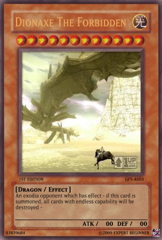 RAEGING D0GKING Posted May 2, 2009 Report Share Posted May 2, 2009 ok my cardseffectThis card cannot be Normal Summoned or Set.This card can only be Special Summoned by removing from play all Beast-Type monsters in your Graveyard and by tributing 2 Beast-Type monsters on your side of the field. The ATK and DEF of this card is x 800 of the number of cards removed from play to Special Summon this monster card. Once per turn, you can pay 500 Life Points to destroy all Spell and Trap Cards on the field. one of change heart cards spammer Link to comment Share on other sites More sharing options...