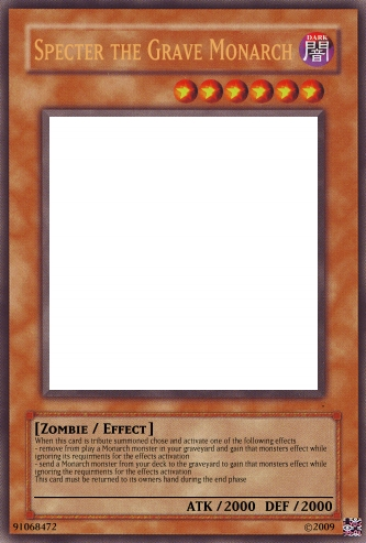 paradoxgears Posted May 26, 2009 Report Share Posted May 26, 2009 I think this would be the god of monarchs Specter the Grave Monarch Zombie 6 Stars Atk 2000 Def 2000effect When this card is tribute summoned chose and activate one of the following effects- remove from play a Monarch monster in your graveyard and gain that monsters effect while ignoring its requirments for the effects activation- send a Monarch monster from your deck to the graveyard to gain that monsters effect while ignoring the requirments for the effects activation This card must be returned to its owners hand during the end phase Link to comment Share on other sites More sharing options...