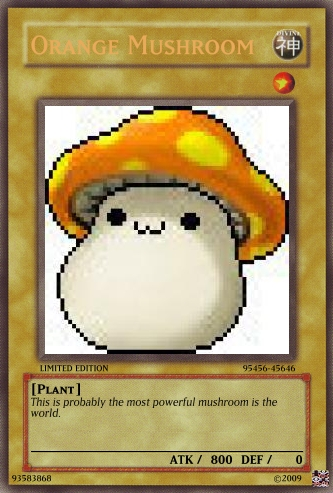qwerty the x Posted June 19, 2009 Report Share Posted June 19, 2009 ][/color][/size][/font]These are some of my first cards, if errors such as unproffessional text or not capitalizing word, ignore them. This is also my first post, even though i have been a member for a while, because at first i didn't want to show my cards. Also, i am working on a new Archetype, don't be mean at the images, I drew them with the best of my skills on Paint. TEXT FOR RITUAL MONSTER CARD: This card can only be Summoned with the card "Inferno Spell Ritual" and you must offer cards whose LV totals 9 or higher. This card is unaffected by Spell, Trap, or Monster effects. When this card destroys a monster, select one of the following effects.A: Inflict Direct Damage to your opponent equal to the ATK or DEF of the destroyed monster, which ever is higher.B: The opponent must discard cards equal to the LV of the destroyed monster.C: Increase your LP by the LV of the destroyed monster x600 points.D: Your opponent cannot declare a Draw Phase or Battle Phase during their next turn. **NOTE** : the card "Orange Mushroom" is from MapleStory, a online game. I just made it because the mushroom is funny and it is pure ownage!!! **NOTE** : DON'T ask me why there are so many Normal cards, hey there have to be some anyways. **NOTE** : these are my first cards, some are not because you can tell the text is more like a REAL card. Link to comment Share on other sites More sharing options...