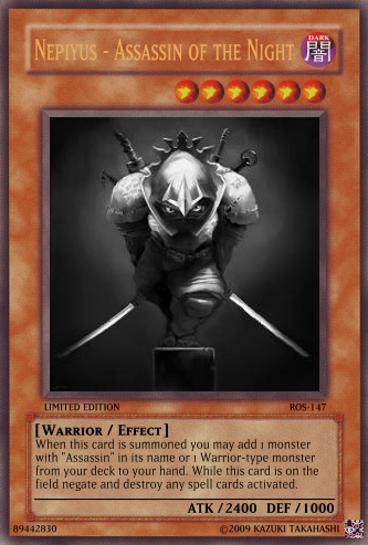 EliteKill Posted June 29, 2009 Author Report Share Posted June 29, 2009 I agree with Evilfusion' date=' mainly. He needs something different to make him a bit stronger... since you're at tiny font already, I'd stick this on the end; "If this card is destroyed and sent to the Graveyard, remove it from play instead." That might SEEM immaterial, but it really makes him MUCH better. See, the effect doesn't distinct that its effect only activates when he removes himself from play, so it doesn't matter how he was sent there, he will still revive himself at any End Phase. Which kinda makes him like D.D. Scout Plane, only he's an 8 star that can possibly unload the hurt. In fact, viewed in that light, he becomes perfect tribute fodder for Macro Monarchs, and in fact could make an entire RFG swarm deck plausible...[/quote'] That could make it work, but it can also screw you up... I'll add that. I'm also going to make some supprot card from him. Also, for a deck based around him, cards like Gold Srcophagus will be needed to get him in your hand... EDIT: A simple but effective Support Card added. Link to comment Share on other sites More sharing options...