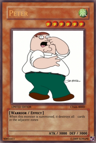 Casmy Posted October 15, 2009 Author Report Share Posted October 15, 2009 :D.Hi' date=' I am new but I wonder what you think of my family guy card of peter. I am Yugiohkingofhell.[hr']How do I post my cards? No attach!!! On other's threads especially!!! Link to comment Share on other sites More sharing options...