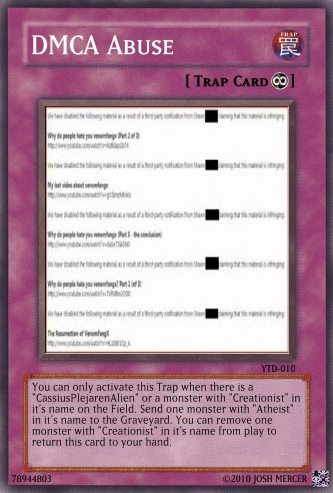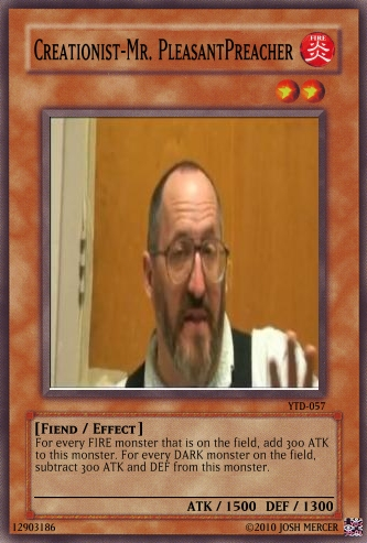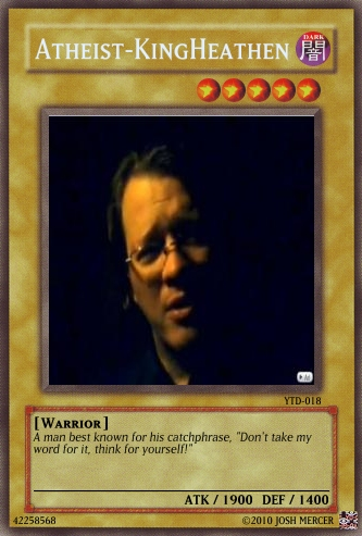 SCRuler Posted March 15, 2010 Report Share Posted March 15, 2010 Yeah, I'm rather new to the site. This is my first post. However, I was rather surprised when I saw the maker and it's capabilities. So I set out to make a deck based in a conflict I am part of on YouTube which reflects the world: The dispute between Atheists and Creationists. It gets quite dirty.I know they may be a little overpowered (especially on part of the Atheists. lol the majority of the cards are Atheist ones.) but for one thing it kind of reflects reality. As well, I tried my best with Original Card Grammar. I even referenced the Yu-Gi-Oh Wiki numerous times for such. I hope it's accurate as per game needs.Without Further Ado, here are a few. Some of the ones omitted from the initial post have slightly vulgar language, such as Vogter's card. Not something I want to remove as it reflects their intensity, but oh well. Hope you like them. Link to comment Share on other sites More sharing options...
