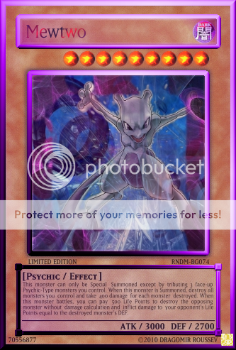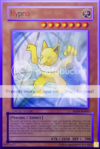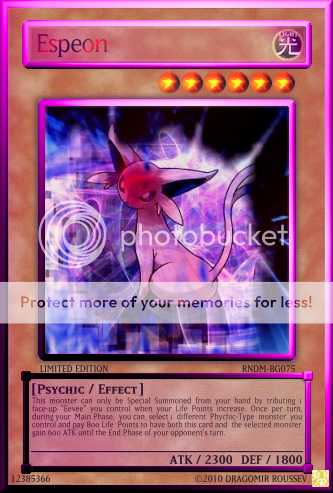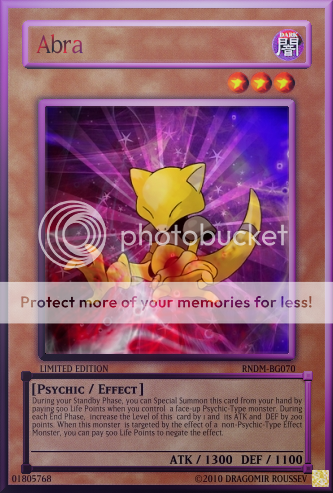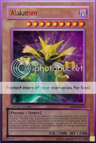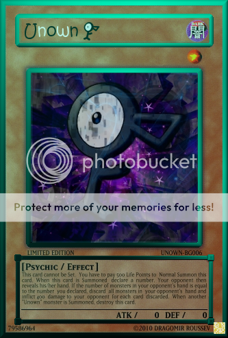 NeosWiseman Posted May 26, 2010 Report Share Posted May 26, 2010 Pokemon Phychic monsters made into Yu-Gi-Oh cards (inspired by destinydramonX)More coming soon! http://i960.photobucket.com/albums/ae87/NeosWiseman_2/Hypno.png' alt='Hypno.png'> http://i960.photobucket.com/albums/ae87/NeosWiseman_2/Abra.png' alt='Abra.png'>[/center] http://i960.photobucket.com/albums/ae87/NeosWiseman_2/Alakazam.png' alt='Alakazam.png'>http://i960.photobucket.com/albums/ae87/NeosWiseman_2/Mew.png' alt='Mew.png'>[/center] http://i960.photobucket.com/albums/ae87/NeosWiseman_2/Mewtwo.png' alt='Mewtwo.png'> http://i960.photobucket.com/albums/ae87/NeosWiseman_2/Espeon.png' alt='Espeon.png'> Unown SeriesUnown Series http://i960.photobucket.com/albums/ae87/NeosWiseman_2/UnownF.png' alt='UnownF.png'>[spoiler=[b]Lore:[/b]]This card cannot be Set. You have to pay 500 Life Points to Normal Summon this card. When this card is Summoned declare a number. Your opponent then reveals his/her hand. If the number of monsters in your opponent's hand is equal to the number you declared, discard all monsters in your opponent's hand and inflict 400 damage to your opponent for each card discarded. When another "Unown" monster is Summoned, destroy this card. Link to comment Share on other sites More sharing options...