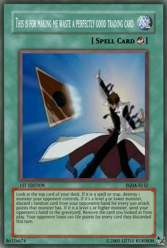 Tukosai Posted June 1, 2010 Report Share Posted June 1, 2010 Just some cards I made with reasonable effects and understandable references. (The "I said- YOU'RE DEAD" is a GX Abridged card And I understand there's typo is on the seto one, just too lavy to repost) This is what I have so far, feedback? Link to comment Share on other sites More sharing options...