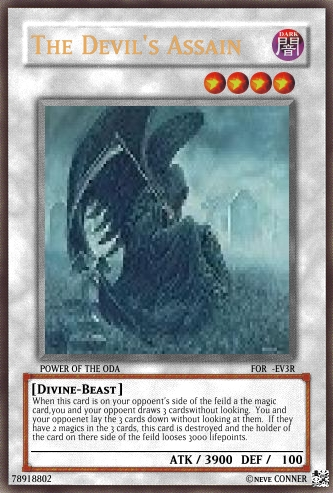 Enigma Zero Posted April 28, 2008 Report Share Posted April 28, 2008 Gee, thanks for changing the topic title to include my name...no pressure there. :P Ok, so I'm done. For the final round in this contest I thought I wouldn't so much improve something that already exists but break from my own trend and make a completely new victory condition for the game. Oh well, here's hoping I live up to the hype this time around...it's only the finals. :lol: [spoiler=Final Round...FIGHT!][spoiler=The Cards]Card Text:FLIP: Destroy 1 Spell or Trap card on your side of the field and 1 Spell or Trap card on your opponent's side of the fied , this card's effect is changed to the following:• This card is switched perminantly to Defense Position. This card cannot be destroyed by battle. All Battle Damage to this card's controller that he/she takes from a battle involving this monster becomes 0. This card's name is treated as "Elemental Master of Air" while it is face-up on the field. Card Text:During the End Phase of a turn in which this card was attacked by your opponent's monster but was not destroyed, this card's effect is changed to the following:• This card is switched perminantly to Defense Position. This card cannot be destroyed by battle. All Battle Damage to this card's controller that he/she takes from a battle involving this monster becomes 0. This card's name is treated as "Elemental Master of Earth" while it is face-up on the field. Card Text:When this card Destroys an opponent's monster by battle and sends it to the Graveyard, this card's effect is changed to the following:• This card is switched perminantly to Defense Position. This card cannot be destroyed by battle. All Battle Damage to this card's controller that he/she takes from a battle involving this monster becomes 0. This card's name is treated as "Elemental Master of Fire" while it is face-up on the field. Card Text:This card can attack your opponent's Life Points directly. If this card successfully attacks directly, this card's effect is changed to the following:• This card is switched perminantly to Defense Position. This card cannot be destroyed by battle. All Battle Damage to this card's controller that he/she takes from a battle involving this monster becomes 0. This card's name is treated as "Elemental Master of Water" while it is face-up on the field. Card Text:1 "Elemental Master of Air" + 1 "Elemental Master of Earth" + 1 "Elemental Master of Fire" + 1 "Elemental Master of Water" This monster cannot be Special Summoned except by Fusion Summon. A Fusion Summon of this card can only be conducted with the above Fusion Material Monsters. Unite all of your opponent's cards in their Graveyard and removed from play with their Deck and shuffle them. Your opponent can draw up to 5 cards. If this card is on your side of the field during your next Standby Phase, you win the duel. Note: You should be able to easily read the rest of these. If not then let me know and I'll add Card Text for them as well. [spoiler=Artistic Credits]Adept of Air: -Image by C. Jonathan Hunt. Adept of Earth: -Image by Jason Engle. Adept of Fire: -Image by Jason Engle. Adept of Water: -Image by John Donahue. Baransu - Dragn Master of the Elements: -Editing, Manipulation, and Effects by Enigma Zero. -Background by Enigma Zero. -Image by jayanth_1489 Adept of The Void: -Image by Jason Engle. Cycle of Balance: -Image by Lee Moyer. Forced Balance: -Image by Mike Jackson. [spoiler=Concept Explanation]Since someone already mentioned this to me(who shall remain nameless) I thought it would be a good idea to write a short outline on how this system works for those who may read these cards and be left scratching their heads. Here's how it works...-Step 1: Summon an Adept.-Step 2: Use it's effect, which turns it into an Elemental Master. -Step 3: Get the 4 Elemental Masters(Air,Fire,Earth, and Water) on the field in face-up position).-Step 4: Fusion Summon Baransu. -Step 5: If Baransu is still on the field during your next standby phase...YOU WIN. The system was made intentionally difficult because the payoff is that you win. It's 1 monster that you have to perform all of these tasks in order to be able to fusion summon and since the Elemental Master cards do not exist in the game unless you change a Adept into one it means there's only one real way to summon the big guy. Then you have to keep it alive. If not, you're basically back to square 1. If there are still any questions after this then, please, feel free to PM me and I will do my best to edit this part of my submission to answer any questions that might still need answering. ;) And there you have it. The 8 cards that I hope are good enough to finish this wild ride and win it. It was frantic at times and mindracking at others but in the end...it was a blast. Now someone should change the topic title from "AWAITING ENIGMA FOR RESULTS!" to "ENIGMA IS DONE...JUDGE THIS THING!" See you all at the end. Link to comment Share on other sites More sharing options...