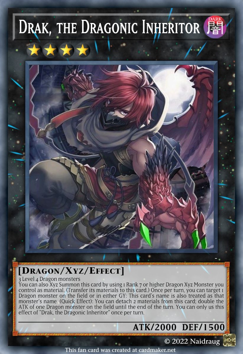 Naidraug Posted September 10, 2022 Report Share Posted September 10, 2022 Original Image: https://www.pinterest.com/pin/765682374139014224/ Drak, the Dragonic Inheritor DARK Rank 4 2000/1500 Dragon/Xyz/Effect 3 Level 4 Dragon monsters You can also Xyz Summon this card by using 1 Rank 7 or higher Dragon Xyz Monster you control as material. (Transfer its materials to this card.) Once per turn, you can target 1 Dragon monster on the field or in either GY: This card's name is also treated as that monster's name. (Quick Effect): You can detach 2 materials from this card; double the ATK of one Dragon monster on the field until the end of the turn. You can only use this effect of "Drak, the Dragonic Inheritor" once per turn. Next: A Rank 5 or higher monster that can attach Spells and/or Traps as material Link to comment Share on other sites More sharing options...