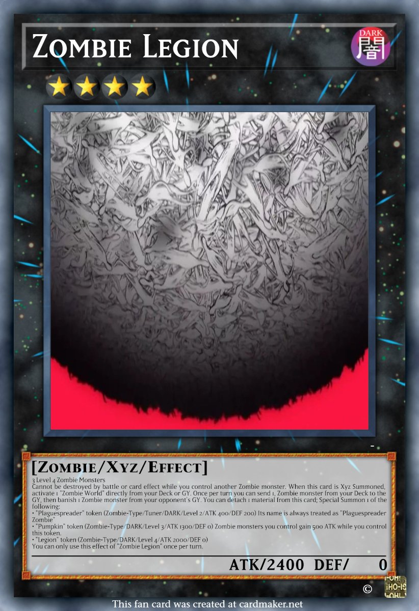 Baron-777 Posted November 17, 2022 Report Share Posted November 17, 2022 On 11/14/2022 at 10:38 PM, Card Game Necromancer said: Ancestral Dracosaurus Wrex Attribute: Fire Rank: 4 Dragon/XYZ/Effect ATK: 2400 DEF: 1700 2+ Level 4 Dinosaur, Reptile, and/or Dragon Monster If this Monster is XYZ Summoned: You can attach 1 Monster from your Deck to this Monster as an XYZ Material with the same Type as one of the Monsters attached to this card. All Dinosaur, Reptile, and Dragon Monsters you control, except this card, gain 300 ATK/DEF for each XYZ Material on this card. At the Start of the Damage Step, If this Monster battles an Opponent's Monster: You can detach 1 XYZ Material from this card and target 1 other Dinosaur, Reptile, or Dragon Monster on your Field or in your Graveyard; This monster gains ATK/DEF equal to that Monster's ATK/DEF until the end of the Damage Calculation. you can only use each effect of Ancestral Dracosaurus Wrex once per turn. Next: How about an almost broken Rank 4 that exclusively helps Zombies. Can help with Zombie World playstyles Almost broken it is then. *cracks neck in preparation for writing a wall of text* Name: Zombie Legion Rank 4 DARK/Zombie/Xyz/Effect Materials: 3 Level 4 Zombie monsters ATK 2400/DEF 0 Effect: "Cannot be destroyed by battle or card effect while you control another Zombie monster. When this card is Xyz Summoned, activate 1 "Zombie World" directly from your Deck or GY. Once per turn you can send 1, Zombie monster from your Deck to the GY; Banish 1 Zombie monster from your opponent's GY. You can detach 1 material from this card; Special Summon 1 of the following: • "Plaguespreader" token (Zombie-Type/Tuner/DARK/Level 2/ATK 400/DEF 200) Its name is always treated as "Plaguespreader Zombie" • "Pumpkin" token (Zombie-Type/DARK/Level 3/ATK 1300/DEF 0) Zombie monsters you control gain 500 ATK while you control this token. • "Legion" token (Zombie-Type/DARK/Level 4/ATK 2000/DEF 0) You can only use this effect of "Zombie Legion" once per turn." Next: Opposites attract. Make a rank 5 or higher, Warrior type monster that is slightly underpowered. Link to comment Share on other sites More sharing options...