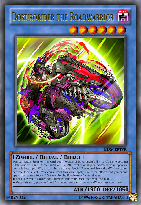 Black D'Sceptyr Posted February 19, 2022 Report Share Posted February 19, 2022 been a while, but let's bring this back again with a new killer Ritual. Dokurorider the Roadwarrior/DARK/Zombie-Type Ritual Effect Monster/Level 6/1900 ATK/1850 DEF Lore: You can Ritual Summon this card with "Revival of Dokurorider". This card's name becomes "Dokurorider" while in the hand or GY. All Level 7 or higher monsters your opponent controls lose 1900 ATK, also if this card was Special Summoned from the GY, they cannot activate their effects. You can discard this card; apply 1 of these effects, but you cannot apply that same effect of "Dokurorider the Roadwarrior" again that turn. ● Set 1 "Revival of Dokurorider" directly from your Deck, then you lose 1900 LP. ● Once this turn, you can Ritual Summon 1 monster from your GY, not just your hand. __________________ Next: A Ritual Monster that specifically mentions a Ritual Summoning Spell/Trap in its name... that does not Tribute face-up monsters on the field to Summon? List of potential candidates for cards to use (currently) is in the spoiler below. Gishki Photomirror High Ritual Art Advanced Ritual Art Super Soldier Synthesis Vendread Reunion Turning of the World Link to comment Share on other sites More sharing options...
