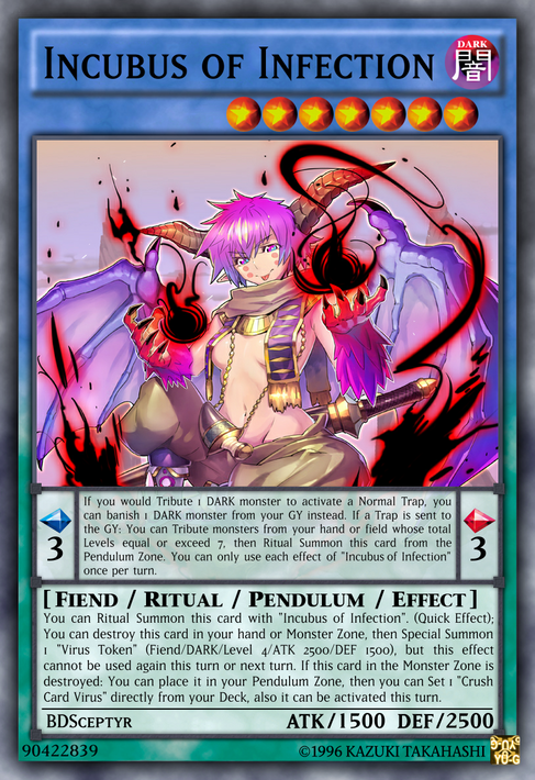 Black D'Sceptyr Posted March 3, 2022 Report Share Posted March 3, 2022 gonna be hard to make the effect correspond to the immortals, but I think I got close Incubus of Infection/DARK/Fiend-Type Ritual Pendulum Effect Monster/Level 7/1500 ATK/2500 DEF Scales: 3/3 Pendulum Lore: If you would Tribute 1 DARK monster to activate a Normal Trap, you can banish 1 DARK monster from your GY instead. If a Trap is sent to the GY: You can Tribute monsters from your hand or field whose total Levels equal or exceed 7, then Ritual Summon this card from the Pendulum Zone. You can only use each effect of "Incubus of Infection" once per turn. Lore: You can Ritual Summon this card with "Incubus of Infection". (Quick Effect); You can destroy this card in your hand or Monster Zone, then Special Summon 1 "Virus Token" (Fiend/DARK/Level 4/ATK 2500/DEF 1500), but this effect cannot be used again this turn or next turn. If this card in the Monster Zone is destroyed: You can place it in your Pendulum Zone, then you can Set 1 "Crush Card Virus" directly from your Deck, also it can be activated this turn. ______________ Next: Make a Ritual Monster Summonable by a Ritual Spell that does not involve moving monsters to a different place or paying LP to Ritual Summon a monster. Bonus points if the Ritual Monster is Level 11. Link to comment Share on other sites More sharing options...