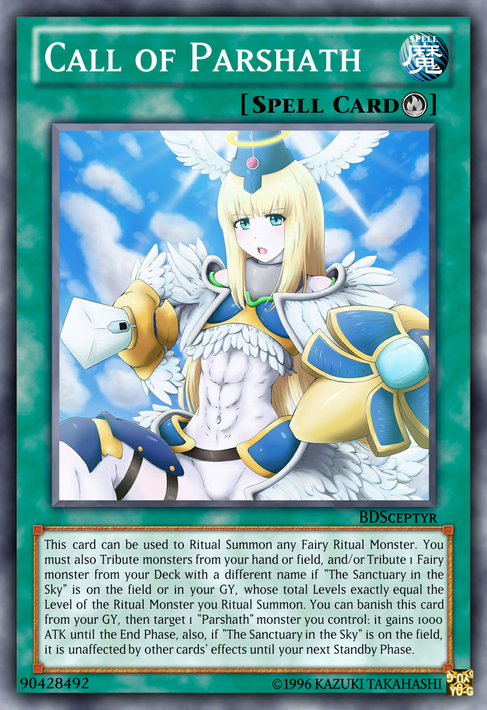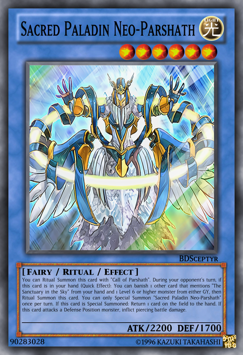 Black D'Sceptyr Posted July 1, 2022 Report Share Posted July 1, 2022 Sacred Paladin Neo-Parshath/LIGHT/Fairy-Type Ritual Effect Monster/Level 6/2200 ATK/1700 DEF Lore: You can Ritual Summon this card with "Call of Parshath". During your opponent's turn, if this card is in your hand (Quick Effect): You can banish 1 other card that mentions "The Sanctuary in the Sky" from your hand and 1 Level 6 or higher monster from either GY, then Ritual Summon this card. You can only Special Summon "Sacred Paladin Neo-Parshath" once per turn. If this card is Special Summoned: Return 1 card on the field to the hand. If this card attacks a Defense Position monster, inflict piercing battle damage. Call of Parshath/Ritual Spell Card Lore: This card can be used to Ritual Summon any Fairy Ritual Monster. You must also Tribute monsters from your hand or field, and/or Tribute 1 Fairy monster from your Deck with a different name if "The Sanctuary in the Sky" is on the field or in your GY, whose total Levels exactly equal the Level of the Ritual Monster you Ritual Summon. You can banish this card from your GY, then target 1 "Parshath" monster you control: it gains 1000 ATK until the End Phase, also, if "The Sanctuary in the Sky" is on the field, it is unaffected by other cards' effects until your next Standby Phase. _________ Next Up: Let's see if we can compound on the love that the Abyss storyline got recently. A Ritual for any of the Abyss Story Archetypes - Dogmatika, Tri-Brigade, Springans, Icejade, Swordsoul, Despia, Branded, Therions, Splight, or even this newfound Byssted Archetype is in order. Bonus points, of course, if the Ritual Spell mentions "Fallen of Albaz" Link to comment Share on other sites More sharing options...