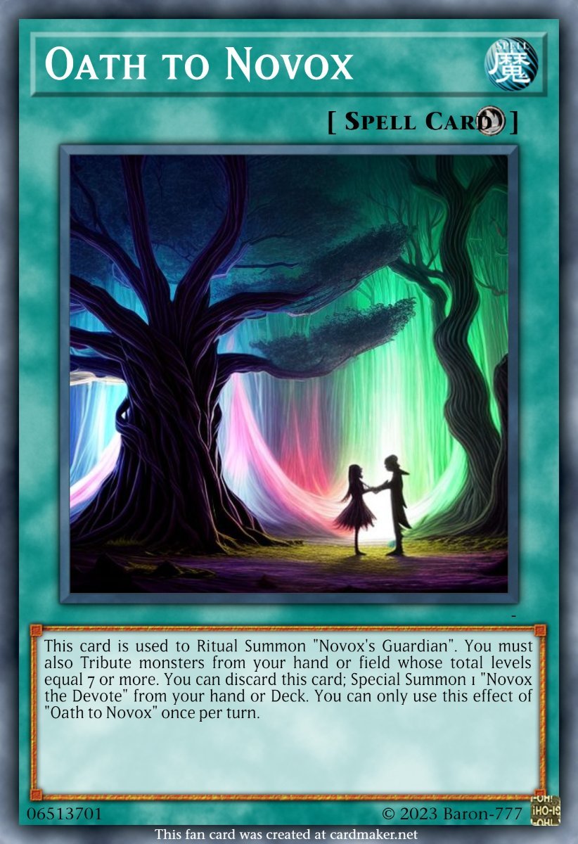 Baron-777 Posted July 26, 2023 Report Share Posted July 26, 2023 Can't get too much older then this. A retrain of Skull Guardian Name: Novox's Guardian LIGHT/Warrior/Ritual/Effect Level 7 ATK: 2050/DEF2500 Effect: You can Ritual Summon this card with "Oath to Novox". If a "Novox" monster, except "Novox's Guardian" you control would be destroyed by battle or card effect; you can Special Summon this card from your hand in Defense Position, ignoring its summoning conditions. "Novox" monsters, except "Novox's Guardian", cannot be destroyed by battle or card effect. And its accompanying Ritual Spell: Name: Oath to Novox Spell/Ritual Effect: This card is used to Ritual Summon "Novox's Guardian". You must also Tribute monsters from your hand or field whose total levels equal 7 or more. You can discard this card; Special Summon 1 "Novox the Devote" from your hand or Deck. You can only use this effect of "Oath to Novox" once per turn. BONUS: Name: Novox the Devote LIGHT/Spellcaster/Effect Level 3 ATK 1050/DEF 1500 Effect: LIGHT Ritual Monsters you control gain 1000 DEF. If a Ritual Monster with DEF greater then its ATK attacks or is attacked: it gains ATK equal to the difference between its DEF and ATK until the End Phase. NEXT: A ritual evolution of a Normal Monsters, EXCEPT a popular Ace Monsters (Dark Magician, Blue-Eyes, Neos, est.) Link to comment Share on other sites More sharing options...