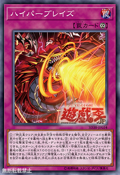Ryusei the Morning Star Posted February 12, 2020 Report Share Posted February 12, 2020 SD38-JP001 Genmaoh Raviel – Tenkai Juurinken / Raviel, Lord of Phantasms – Heaven Crushing Fist (Dub: Raviel, Lord of Phantasms – Shimmering Scraper) Dark Fiend / Special Summon / Effect LV10 4000/4000 Cannot be Normal Summoned/Set. Must be Special Summoned (from your hand) by Tributing 3 monsters. You can only use this card name’s (1) and (2) effects once per turn each. (1) (Quick Effect): You can discard this card, then target 1 “Raviel, Lord of Phantasms” you control; for the rest of this turn, its ATK is doubled, also it can attack all monsters your opponent controls, once each. (2) If this card is in your GY: You can Tribute 1 monster; add this card to your hand. SD38-JP003 Ankoku no Shouraishin / Dark Beckoning Beast Level 2 DARK Fiend Effect Monster ATK 0 DEF 0 You can only use this card name’s (1) effect once per turn. (1) When this card is Normal Summoned: You can add 1 “Uria, Lord of Searing Flames”, 1 “Hamon, Lord of Striking Thunder”, 1 “Raviel, Lord of Phantasms”, or 1 card that specifically lists any of those names in its text from your Deck to your hand, except “Dark Beckoning Beast”. (2) During your Main Phase, you can Normal Summon 1 Fiend monster with 0 ATK and DEF, in addition to your Normal Summon/Set (you can only gain this effect once per turn). SD38-JP019 Shitsuraku no Hekireki / Lightning Strike of Paradise Lost (Dub: Cerulean Sky Fire) Continuous Spell Card (1) To Special Summon “Hamon, Lord of Striking Thunder” using its own procedure, you can send face-down Spells you control to the GY instead of face-up Continuous Spells (or any combination of both). (2) Once per turn, when an opponent’s activated Spell/Trap Card or effect resolves while you control an Attack Position “Hamon, Lord of Striking Thunder”, you can negate that effect, then change 1 “Hamon, Lord of Striking Thunder” you control to Defense Position. (3) If “Uria, Lord of Searing Flames”, “Hamon, Lord of Striking Thunder”, or “Raviel, Lord of Phantasms” you control leaves the field: You take no damage for the rest of this turn. SD38-JP034 Hyper Blaze Continuous Trap Card (1) To Special Summon “Uria, Lord of Searing Flames” using its own procedure, you can send face-down Traps you control to the GY instead of face-up ones (or any combination of both). (2) When an attack is declared involving your “Uria, Lord of Searing Flames”: You can send 1 Trap from your hand or Deck to the GY; its ATK/DEF becomes 1000 x the number of Traps on the field and in the GYs for the rest of this turn. (3) Once per turn: You can discard 1 card; take 1 “Uria, Lord of Searing Flames”, “Hamon, Lord of Striking Thunder”, or “Raviel, Lord of Phantasms” from your GY, and either add it to your hand or Special Summon it, ignoring its Summoning conditions Link to comment Share on other sites More sharing options...