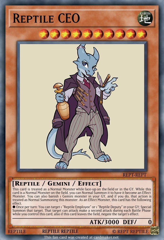 Pommelo Posted June 17, 2021 Report Share Posted June 17, 2021 1 hour ago, ITSUKOSOADO said: Fish Curry (it's spicy :P) Counter trap When a effect is activated that would deal you effect damage, tribute one fish you control and take control of an opponent's monster with ATK less than the ATK of the tributed monster + the damage that would have been taken. If you would take effect damage while this card is in your GY, negate the damage and special summon a fish with less DEF then the damage you would have taken then gain LP equal to the original ATK or DEF (whichever is lower) of all fish monsters you control. Next: -Corporate theme - The word "reptile" is everywhere on the card (type, effect, and name). - level 10+ that can be normal summoned in alternative way - Gemini Nuuuuuuuuu, I was halfway making the reply to Dramatic Crossroad's prompt T_T. Oh well, no can do ~~~~ There you go, Itsu, Reptile eveywhere ~~~~~ Next: * Cosmos Attribute * Can banish cards in your opponent's Extra Deck * Serves as "Joker" to complete an Extra Link (as in, this is NOT a Link Mob, but if in the middle of Links, it is treated as pointing at them). * Can banish cards in your GY as substitute of Tributing monster you control as cost, but this substitute has a hefty cost. Link to comment Share on other sites More sharing options...
