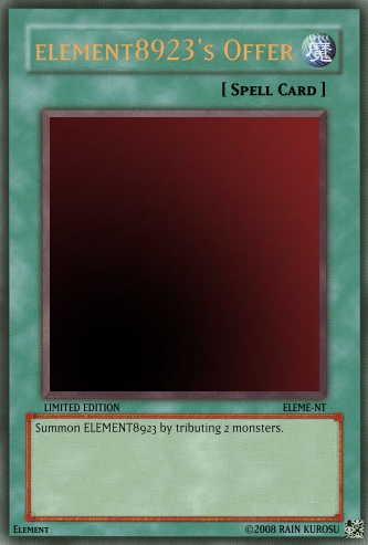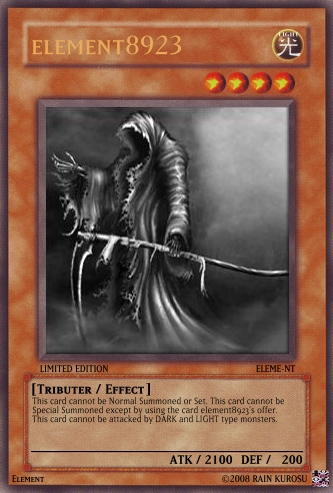 Rain Kurosu Posted May 10, 2008 Report Share Posted May 10, 2008 Sorry but I could only make these as attachments :(element8923 here your tribute from me goes :) and the card to summon you: Edit: The Reaper is a picture from google images but the other one I made myself :)Edit2: I edited the Reaper so it doesn't have all the stuff the original had (I think my version is better) Link to comment Share on other sites More sharing options...