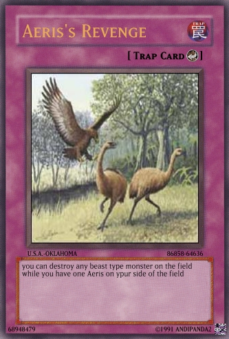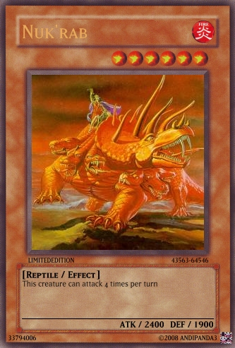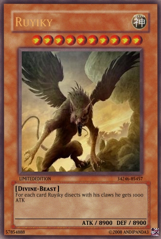 Skarlet Posted May 15, 2008 Report Share Posted May 15, 2008 Ok dude... not bad for a first attempt, but i couldnt make heads or tails of cerberus at first, so heres how i would phrase it "When this card is summoned place a (your choice of counter name) Counter on it, during your battle phase you may remove the (Whatever you call it) counter to allow this card to attack 3 times during this turn." you may also want to make cerberus more like lvl 7 or 8. Link to comment Share on other sites More sharing options...