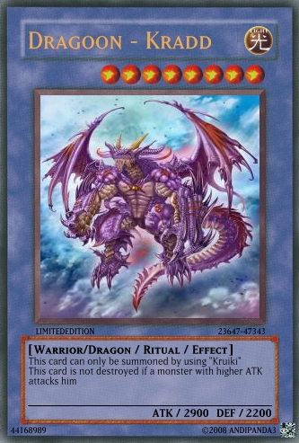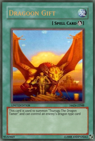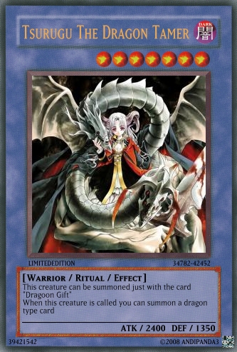 EksDee Posted May 13, 2008 Report Share Posted May 13, 2008 You need to work on your wording a little. For example, Tsurugu the Dragon Tamer should be something like This card cannot be special summoned or set. This card can only be ritual summoned by the effect of "Dragoon Gift".When this card is successfully Ritual Summoned, Special Summon one Dragon-type monster from your hand. 4.5/10 Link to comment Share on other sites More sharing options...