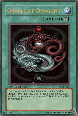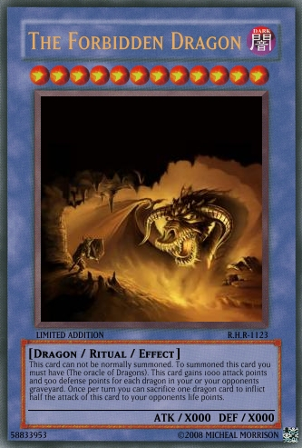 Toxic_X Posted May 15, 2008 Report Share Posted May 15, 2008 I Really like "The Forbidden Dragon" and his ritual card. Link to comment Share on other sites More sharing options...