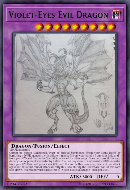 Pommelo Posted November 21, 2021 Author Report Share Posted November 21, 2021 On 11/19/2021 at 10:35 PM, Blue Arcana said: Based off of the Spiritual Armor of God, found in Ephesians 6. You can only equip this card to a Level 4 LIGHT Warrior monster. Monsters equipped to this card gain 300 ATK and cannot be destroyed by battle. When this face-up card is destroyed by a card effect: You can Set 1 "Celestial Armor" Equip Spell except "Celestial Armor - Helm of Salvation" directly from your Deck. You can only use this effect of "Celestial Armor - Helm of Salvation" once per turn. I did this one as a Fusion of Relinquished and Thousand Eyes Restrict You can Ritual Summon this card with "Black Illusion Ritual". This card's original ATK becomes equal to its Level x200. Once per turn, You can target 1 monster in your opponent's GY; Equip it to this card, and if you do, apply 1 of these effects based on its Level: ● 1-4 - This card's Level increases by the equipped monster's Level. Once per turn, You can target 1 monster on the field; change its Battle Position. ● 5 or 6 - This card's Level increases by the equipped monster's Level. Once per turn, You can target 1 card on the field; negate its effects. ● 7 or 8 - This card's Level increases by the equipped monster's Level. Once per turn, When this card battles a monster: You can discard 1 card; This card gains 600 ATK until the end of this turn. You can only use 1 effect of "Cosmic Entity, Soul Eater" per turn. My favourite piece out of the entire set. 3 DARK monsters. Cannot be Fusion Summoned. Must be Special Summoned (from your Extra Deck) by banishing 3 DARK monsters with different names (1 from your hand, 1 from your field and 1 from your GY) and Cannot be Special Summoned by other ways. Once per turn, if this card destroys an opponent's monster by battle: You can pay 1000 LP and banish 1 DARK monster from your GY; This card gains 1000 ATK, until the end of this turn, also, this card can attack again, but this card cannot attack directly this turn. During the End Phase: Banish this card face-down. You can only use each effect of "Violet-Eyes Evil Dragon" once per Duel. Oh, great, more cards with self-drawn artworks! What can I say? You have a pretty good sense of balance, they all are well done imo. On 11/19/2021 at 11:56 PM, Zefra Zamazenta said: Here I made Some Pokemon into Yugioh cards Zeraora 2300/2000 fun fact Zeraora has the same ATK as Decode Talker and friends and Accesscode Talker too Effect: You can Special Summon this card (from your hand) by banishing the top card of your Deck face-up. You can only Special Summon "Zeraora" once per turn this way. Unaffected by cards and effects activated in the hand. Any cards or effects activated in the hand are negated and banished. During your Main Phase: You can banish up to 3 monsters from your hand and/or field; look at your opponent's hand, then discard the same number from your opponent's hand. You can only use this effect of "Zeraora" once per turn. Dracovish 2500/3000 Effect: If you control a WATER, Sea Serpent, Dragon, or Wyrm monster, you can Special Summon this card (from your hand). You can only Special Summon "Dracovish" once per turn this way. At the start of the Damage Step, if this card battle a monster whose ATK or DEF (whichever is higher) is equal or higher then this card's original ATK: You can make that that opponent's monster loses ATK or DEF equal to its own ATK or DEF, until the end of this turn, and if it does, this card gains ATK equal to the ATK or DEF lost, until the end of this turn, also for the rest of this turn, if this card attacks a Defense Position monster, inflict piercing battle damage to your opponent. If a monster this card battled was destroyed by battle: You can make your opponent discards 1 random card. You can only use each effect of "Dracovish" once per turn. Fun fact Dracovish is part of my made up stories in the Fallen of Albaz Story/Lore he is suppose to be a part of the story Swordsoul and Icejade. Dracovish Lives with the Icejades and attacks the Swordsouls Fun fact did you know I like Swordsoul Fallen of Albaz Story/Lore was the reason why I made Dracovish into a Yugioh card. Alright! Good to see you posting. Also, I didn't know you write fanfiction, Zama, interesting! On 11/20/2021 at 12:40 AM, Naidraug said: This thread sort of inspired me to look at my old sketchbook from a few years ago. And post a card I had made. as well as a drawing i made for it back then. It was sort of made with protagonist ace monster stats in mind. I forget what sort of little story i had made in my head at the time for it though. Dragotech Starlight LIGHT Level 8 Scale 8-8 ATK 2500 / DEF 2100 Dragon/Synchro/Pendulum/Effect Pend. Effect: Once per turn, you can target 1 monster you control in a Main Monster Zone, and 1 monster you control in a Extra Monster Zone; the ATK of the first target becomes 0, and the second target gains ATK equal to the original ATK of the first target until the End Phase. Monster Effect: 1 Tuner + 1+ non-Tuner monsters This monster gains ATK for each monster on the field that was Special Summoned from the Extra Deck x200. Once per turn, if this card is face-up in your Extra Deck, you can banish 1 Tuner monster from your GY, and 1 card your opponent controls; place this card in an unoccupied Pendulum Zone. Man, it's awesome that this thread inspired you to post this creation of yours. Wish I could see more of the drawing, it seems there's more to it judging from that lines on the right that kinda make me think it's a wing. What can be seen looks pretty good, though. The card itself is quite balanced, is anything I'd say it the first monster effect could be a bit stronger (like +300 ATK per Extra Deck Monster, only because, as you say, this is the Ace of the protagonist. A pity you don't remember more about the story >_<'' Link to comment Share on other sites More sharing options...