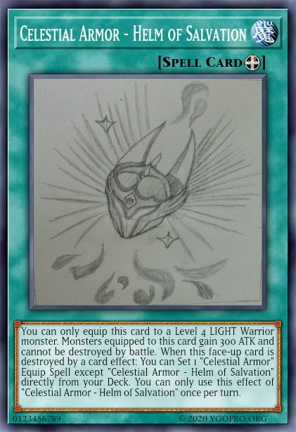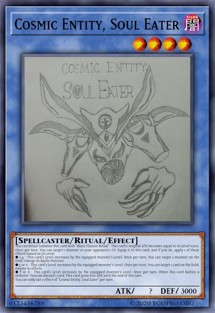Blue Arcana Posted November 20, 2021 Report Share Posted November 20, 2021 1 hour ago, Blue Arcana said: Sry for late reply, but ur welcome :). Unfortunately even if I was to flesh out these bois more, I wouldn't draw the card art for it since time isn't as big a luxury for me. I do have 3 more pieces, Ive already drawn, so they'll be done soon. Based off of the Spiritual Armor of God, found in Ephesians 6. You can only equip this card to a Level 4 LIGHT Warrior monster. Monsters equipped to this card gain 300 ATK and cannot be destroyed by battle. When this face-up card is destroyed by a card effect: You can Set 1 "Celestial Armor" Equip Spell except "Celestial Armor - Helm of Salvation" directly from your Deck. You can only use this effect of "Celestial Armor - Helm of Salvation" once per turn. I did this one as a Fusion of Relinquished and Thousand Eyes Restrict You can Ritual Summon this card with "Black Illusion Ritual". This card's original ATK becomes equal to its Level x200. Once per turn, You can target 1 monster in your opponent's GY; Equip it to this card, and if you do, apply 1 of these effects based on its Level: ● 1-4 - This card's Level increases by the equipped monster's Level. Once per turn, You can target 1 monster on the field; change its Battle Position. ● 5 or 6 - This card's Level increases by the equipped monster's Level. Once per turn, You can target 1 card on the field; negate its effects. ● 7 or 8 - This card's Level increases by the equipped monster's Level. Once per turn, When this card battles a monster: You can discard 1 card; This card gains 600 ATK until the end of this turn. You can only use 1 effect of "Cosmic Entity, Soul Eater" per turn. My favourite piece out of the entire set. 3 DARK monsters. Cannot be Fusion Summoned. Must be Special Summoned (from your Extra Deck) by banishing 3 DARK monsters with different names (1 from your hand, 1 from your field and 1 from your GY) and Cannot be Special Summoned by other ways. Once per turn, if this card destroys an opponent's monster by battle: You can pay 1000 LP and banish 1 DARK monster from your GY; This card gains 1000 ATK, until the end of this turn, also, this card can attack again, but this card cannot attack directly this turn. During the End Phase: Banish this card face-down. You can only use each effect of "Violet-Eyes Evil Dragon" once per Duel. Link to comment Share on other sites More sharing options...