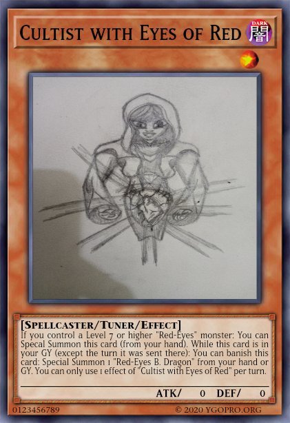Blue Arcana Posted November 19, 2021 Report Share Posted November 19, 2021 Alright, so I found some of my old YuGiOh inspired art and made cards out of them, they wouldve been archetypes but wouldnt have had the time to make them. If "Eyes of Blue" depicts a religious organization decidated to serving the Holy Blue-Eyes, then "Eyes of Red" is a cult determined to release the full Potenial of the Forbidden Red-Eyes. Their theme would be that they are very willing to do whatever it takes to allow Red-Eyes to unleash his full power onto the world, even if it means sacrificing themselves. If you control a Level 7 or higher "Red-Eyes" monster: You can Special Summon this card (from your hand). While this card is in your GY (except the turn it was sent there): You can banish this card: Special Summon 1 "Red-Eyes B. Dragon" from your hand or GY. You can only use 1 effect of "Cultist with Eyes of Red" per turn. When this card is Normal or Special Summoned: You can add 1 Level 3 or lower "Eyes of Red" monster except "Dark Knight with Eyes of Red" from your Deck to your hand. If you control this card while "Red-Eyes B. Dragon" is on the field: This card's Level becomes 1 and its ATK and DEF is halved. While this card is in your GY (except the turn it was sent there): You can tribute 1 "Eyes of Red" monster except "Dark Knight with Eyes of Red" from your hand or field; Special Summon this card from your GY, but banish it when it leaves the field. You can only use this effect of "Dark Knight with Eyes of Red" once per turn. The "Speaker" monsters would be an all female sub-Archetype that directly supports the "Talker" Link monsters, making them easier to get out and having bonuses if you control a specific one. Wonder if they have a crush on those monsters? When this card is Summoned while you control no Link monsters: You can Special Summon up to 2 Talker Tokens (LIGHT/Cyberse/Level 3/Effect/ATK 0/DEF 0). While this card is on the field, Talker Tokens you control gain this effect: ● If this card is used as Link material for a "Talker" Link monster: You can add 1 Level 3 or lower "Speaker" monster except the one(s) you currently control from your Deck to your hand.You can only use this effect once per turn. You can only activate one of the following effects per turn, If you control "Decode Talker": ● You can move this card to a Monster Zone that card points to. ● If this card is tributed by the effect of "Decode Talker": You can add this card from your GY to your hand. Lastly the Battle Spirit archetype would basically be Neo-Spacians but buffed, and maybe some Pends to help you get around Spirits bouncing to hand. They all in some way would gurantee you at minimum 2 monsters on field, recycle themselves to deck for Fusions, if you used their Fusion Spell, you'd get them back to your hand. And their theme is being the personification of all emotions and feelings during actual wars and battles. (Also, yes, their designs would be inspired from Jojo stands.) When this card is Normal Summoned: You can Special Summon 1 "Battle Spirit" monster except "Tenyu, Battle Spirit of Tenacity" from your GY. Once per turn, You can discard 1 card; if this card battles a monster: This card gains 500 ATK until the end of Damage Step. During the End Phase, Unless you control a "Battle Spirit" Fusion monster: Return this card from your field to your hand. You can only use each effect of "Tenyu, Battle Spirit of Tenacity" once per turn. Link to comment Share on other sites More sharing options...