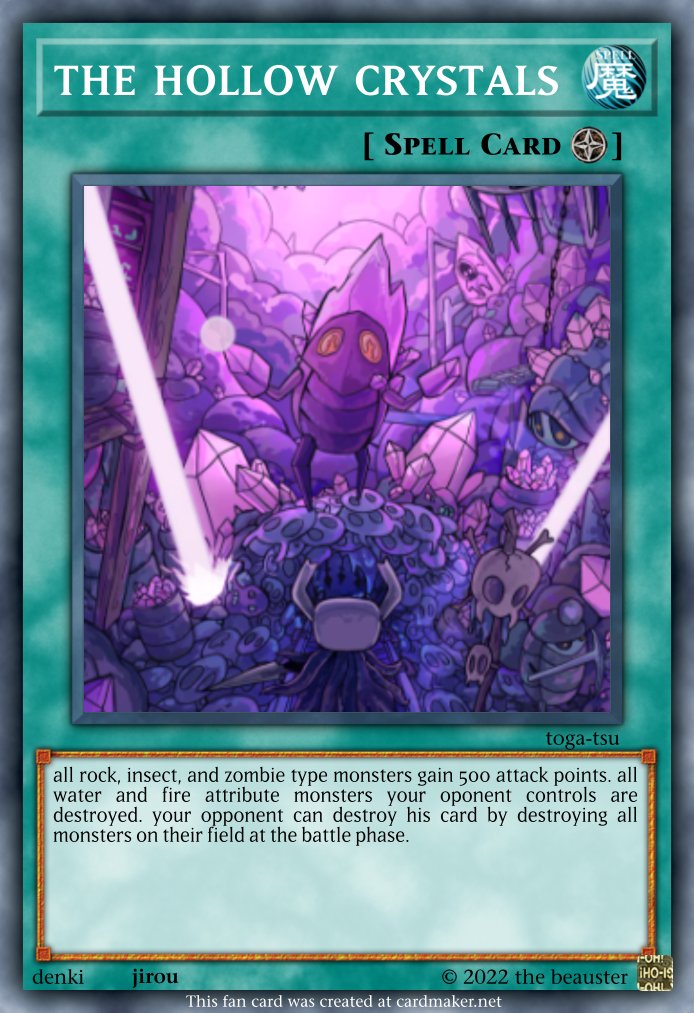 Loleo Posted October 20, 2022 Report Share Posted October 20, 2022 4 hours ago, Beau the shooting star said: super happy fun time hat type:beast-tuner  attributte:light  level:1 atk:100 def:300 when super happy fun time hat is summoned you can summon another super happy fun time monster from your hand in defence mode as long as its below level 4. If this card is summoned: You can Special Summon a level 4 or lower "Super Happy Fun Time" monster from your hand in faceup defense position. Link to comment Share on other sites More sharing options...