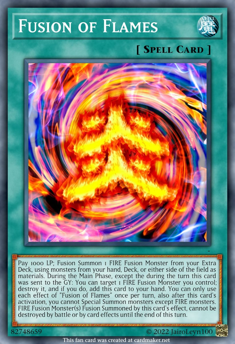 JairoLeyn100 Posted December 25, 2022 Report Share Posted December 25, 2022 Hello there again!! I brought another Attribute related Spell. This time though this one focus on Fusion Summon for FIRE monsters only. This was an idea that I was debating along with the "Rank-Up-Magic Darkness Ascension" Spell. Hope you guys like it, both the effect and the artwork. "Fusion of Flames" Spell - Normal Effect: Pay 1000 LP; Fusion Summon 1 FIRE Fusion Monster from your Extra Deck, using monsters from your hand, Deck, or either side of the field as materials. During the Main Phase, except the during the turn this card was sent to the GY: You can target 1 FIRE Fusion Monster you control; destroy it, and if you do, add this card to your hand. You can only use each effect of "Fusion of Flames" once per turn, also after this card's activation, you cannot Special Summon monsters except FIRE monsters. FIRE Fusion Monster(s) Fusion Summoned by this card's effect, cannot be destroyed by battle or by card effects until the end of this turn. Link to comment Share on other sites More sharing options...