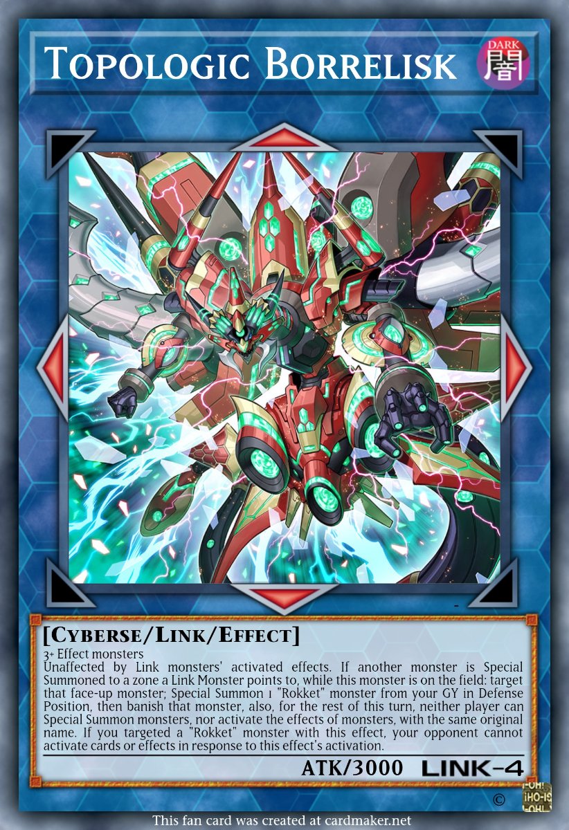EmCee411 Posted January 2, 2023 Report Share Posted January 2, 2023 This is my second batch of Rokket/Borrel custom cards. Only the first one is new, the other four I made almost a year ago, and have made some changes to since then. I felt like I covered my bases pretty well with that first batch, so making a full second batch felt unnecessary. The one new card addresses a new problem that has cropped up with the archetype since that original post, and that problem's name is Borrelend Dragon. But I'll get into that in a bit. First up is Topologic Borrelisk. It follows the naming convention of Trisbaena and Zeroboros by being a portmanteau of a topology term and a mythological serpent, in this case it crosses Borel set with basilisk. The concept of combining Topologic and Borrel card design was attempted with Borrelcode Dragon, but frankly, it utterly failed in every regard. Borrelisk combines the limited protection and spell speed 4 targeting of a Borrel monster with the non-OPT mandatory Link-zone-triggering effect of a Topologic. I made this one because the existence of Borrelend effectively killed the viability of the Rokket control play style, as its effect is better used on the opponent's card than your own Rokkets, and the most common line to bring it out requires you to burn through your Dillingerous Dragon's revival effect right away, trading off that potential follow-up for a Borreload Savage Dragon. It essentially turns the deck into Borrelend Dragon turbo, and that's boring. To solve this, Borrelisk fully leans into the Rokket control play style like no other Borrel has. By summoning a Rokket to the zone it points to, it can effectively rapid fire multiple Rokket effects in quick succession, so long as you're GY is sufficiently set up. To balance this, the trigger to use this effect is the same as a typical Topologic Link 4, meaning most of the time, you'll only be able to manually trigger it once per turn by using Rokket Tracer. Additionally, although the Rokkets that get triggered by Borrelisk won't be banished by its effect, they still will be restricted, meaning not only will they not be able to float in the End Phase, but if you go through every Rokket you have, Borrelisk's effect won't be able to resolve should the opponent make link plays. This way, it rewards both waiting for the right moment to get as much value out of multiple Rokket effects at once, and not blowing your entire load all at once. The summoning and effect restriction also works to prevent it from being used for infinite Link material the way Firewall Dragon was. Twinborrel is a cheaper way to get the Rokket/Borrel combo live, with the tradeoff being that it can only use it's effect twice. It also floats should it be destroyed, allowing fir follow-up on the next turn. I've updated it so that it's also able to target Link monsters, which is relevant because of the next card. Primerrokket Dragon functions the same as other Rokket Dragons, but instead of disrupting the opponent, it searches Borrel cards. It's been updated to search any Borrel card, rather than just spells/traps, adding Borreload Riot Dragon to the search pool. Borrel Munitions was the crown jewel of my previous post. It solves the problem of Rokkets not having a way to "reload" their monsters back into the deck to be used again, while also keeping them in the GY for cards like Boot Sector Launch and Quadborrel Dragon. It also gives the deck an archetypal Foolish Burial for cards like Double Disruptor Dragon and Absorouter Dragon, but while it's up, you're locked into summoning DARKs, so a D-Link deck that plays it is more inclined to make actual Rokket plays. The only update to this card was changing it from affecting "Rokket Dragon" monsters to just "Rokket" monsters, so it now affects Tracer as well. Thunder Borrel Cannon functions either as a disruption going first or spot removal going second. It copies any "Rokket Dragon" effect in the GY by shuffling that card into the deck, which, with the existence of Borrel Munitions, is more of a cost than it sounds like. With this, it can be a non-targeting, non-destruction removal of any card, destroy cards in its column, destroy monsters that are next to each other, negate a monster effect, banish a monster from the Extra Deck, burn both players for 2000, or search a Borrel card. Its effect is very versatile, but also dependant on what you have in your GY, and is only OPT. It's GY effect has been updated to recover Boot Sector Launch in addition to Borrel Spells/Traps, finally giving the deck a means to recover their field spell, and thus making popping it with Tracer a more viable option. Also note, even if Borrelisk prevents you from using the effects of your Rokket monsters, you can still copy them with this, as you're technically not activating that monster's effect. Link to comment Share on other sites More sharing options...