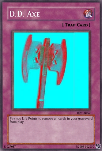 302930 Posted May 21, 2008 Report Share Posted May 21, 2008 These cards are just random cards I made, rate if you want.D.D. axe is supposed to go along with Dimension Distortion spell card. I made Jungle Flytrap because there are just about no good plant-type monsters yet. Enjoy! Link to comment Share on other sites More sharing options...