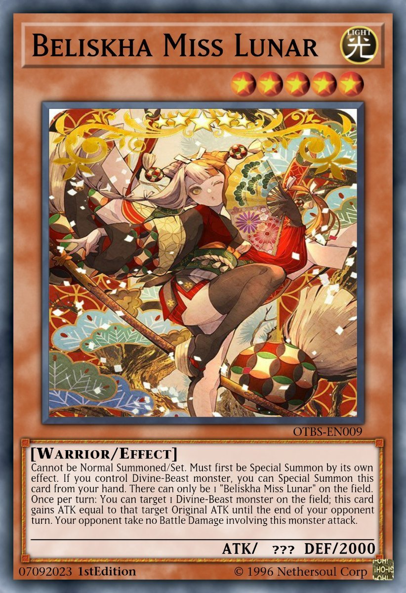BobasasStrong Posted September 8, 2023 Report Share Posted September 8, 2023 7 hours ago, Nethersoul said: "Beliskha Catharina" Level 4/DARK/Beast-Warrior/Effect 1400/1700 You can discard this card from your hand: Special Summon up to 3 "Catelisk Token" (Beast/DARK/Lvl 2/ATK 200/DEF 200). You must have "Obelisk" monster in your GY (min 1) to activate this effect. You can only activate "Beliskha Catharina" effect once per turn. "Beliskha Birdynna" Level 4/LIGHT/Winged-Beast/Effect 1500/1200 When this card Summoned, you can add 1 "Obelisk" monster from your Deck or GY to your Hand. You can only activate this effect once per turn. If this card on the field destroyed and send to your GY, you can Special Summon 2 "Rottelisk Token" (Winged-Beast/DARK/Lvl 2/ATK 300/DEF 150). "Beliskha Femwukong" Level 7/LIGHT/Beast-Warrior/Effect 2700/1500 When you control "Obelisk" monster, you can Special Summon this card from your Hand or GY. You can only Special Summon this ways once per turn. When this card you control tributed by the effect of "Obelisk the Tormentor", you can add this additional effect to that card's effect at resolution. Also after that, banish 2 random card from your opponent hand face-down. "Beliskha Anna, the Mythical Beast Tamer" Level 7/DARK/Wyrm/Effect 2500/2000 You can target 1 "Obelisk the Tormentor" monster you control: Equip this card from your hand or field to that target as a equipped card. The equipped monster becomes unaffected by your opponent card effect, also gains 500 ATK. When the equipped monster would be destroyed, you can tribute this card instead. Once per turn, this equipped card cannot be destroyed by card effect. "Beliskha Seamarry" Level 3/WATER/Aqua/Effect 1200/800 When this card is sent to the GY to activate Divine-Beast monster effect: Target 1 card your opponent control; banish that target. "Beliskha Artondel" Level 4/WIND/Spellcaster/Effect 1800/1000 When this card is tributed: You can add 1 "Obelisk" monster from your Deck to your Hand. You can pay 800 LP (Quick Effect): Target 1 monster your opponent control; return that target and this card to the hand. You can only used each effect of "Beliskha Artondel" once per turn. "Beliskha Prince Catacomb" Level 3/DARK/Zombie/Effect 300/2200 When you control "Beliskha" monster (min 1) except "Beliskha Prince Catacomb", you can Special Summon this card from your GY, and if you do, Special Summon 1 "Mumylisk Token" (Zombie/DARK/Lvl 1/ATK 0/DEF 0). You can only activate this card effect once per turn. You cannot Special Summons monster from the Extra Deck the turn you activate this card effect, except "Beliskha" monster. "Beliskha Rabbitter" Level 3/LIGHT/Beast/Effect 1450/1950 When this card Summoned, you can Normal Summon 1 monster in addition to your Normal Summon/Set. If this card is tributed for Tribute Summon "Obelisk the Tormentor" monster, you can Draw 1 card. You can only used each effect of "Beliskha Rabbitter" once per turn. "Beliskha Miss Lunar" Level 5/LIGHT/Warrior/Effect ???/2000 Cannot be Normal Summoned/Set. Must first be Special Summon by its own effect. If you control Divine-Beast monster, you can Special Summon this card from your hand. There can only be 1 "Beliskha Miss Lunar" on the field. Once per turn: You can target 1 Divine-Beast monster on the field; this card gains ATK equal to that target Original ATK until the end of your opponent turn. Your opponent take no Battle Damage involving this monster attack. "Beliskha Masha the Tormentor" Link-2/DARK/Psychic/Link/Effect [ ↙↘ ] 2000/- 2 "Beliskha" monster with different names You can Tribute Summoned Divine-Beast type monster with 1 less tribute. If you control Divine-Beast monster in a zone this card point to, this card cannot be targeted for an attack or by card effect. During your opponent Standby Phase: Inflict Damage to your opponent equal to a Total Level of Divine-Beast monster on the field x150. "Obelisk the Divine Armor" Level 10/Divine-Beast/Effect 2000/4000 Cannot be Normal Summoned/Set. Must be Special Summoned (from your hand) by tributing 1 "Obelisk the Tormentor", and cannot be Special Summon by other ways. Unaffected by your opponent card effect. During the end phase, your opponent must tribute 1 monster they control or take 2000 LP. Once per turn: You can tribute 1 other monster you control; all monster you control gains 1000 ATK until the end of this turn. "Obelisk the Vengeance Soul" Level 10/Divine-Beast/Effect 3500/3500 Cannot be Normal Summoned/Set. Must be Special Summoned by its own effect, and cannot be Special Summon by other ways. When "Obelisk the Tormentor" you control destroyed and sent to your GY, you can Special Summoned this card from your Hand or GY. Unaffected by your opponent card effect. When this card attack a Defense Position monster, inflict piercing Damage to your opponent. "Obelisk the Corrupted Spirit" Level 10/Divine-Beast/Spirit/Effect 0/4000 Cannot be Normal Summoned/Set. Must be Special Summoned by its own effect, and cannot be Special Summon by other ways. When you control "Obelisk the Tormentor", you can Special Summoned this card from your Hand. Unaffected by your opponent card effect, also cannot be destroyed by battle. Your opponent takes any Battle Damage you would have taken from battle involving this monster you control. During the end phase after this card was summon this turn, return this card to the hand. They are all good but, "Beliskha Anna, the Mythical Beast Tamer" is useless because "Obelisk the Tormentor" cannot be targeted. You should make "Slifer the Sky Dragon" and "The Winged Dragon of Ra" Support cards too. Link to comment Share on other sites More sharing options...