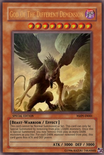 notsohandyman Posted May 23, 2008 Report Share Posted May 23, 2008 Please rate. I'd like to hear your opinions. EDIT: I have placed my adjusted version of "God of Different Demension" as an attachment. EDIT 2: Art credit to the guys @ chewiesdudes.blogspot.com Link to comment Share on other sites More sharing options...