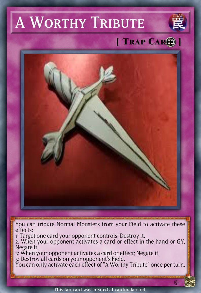 LazerSwordKirbo Posted April 26, 2024 Author Report Share Posted April 26, 2024 Trap card to give some interruption: A Worthy Tribute Continuous Trap You can tribute Normal Monsters from your Field to activate these effects: 1: Target one card your opponent controls; Destroy it. 2: When your opponent activates a card or effect in the hand or GY; Negate it. 3: When your opponent activates a card or effect; Negate it. 5: Destroy all cards on your opponent's Field. You can only activate each effect of "A Worthy Tribute" once per turn. Link to comment Share on other sites More sharing options...