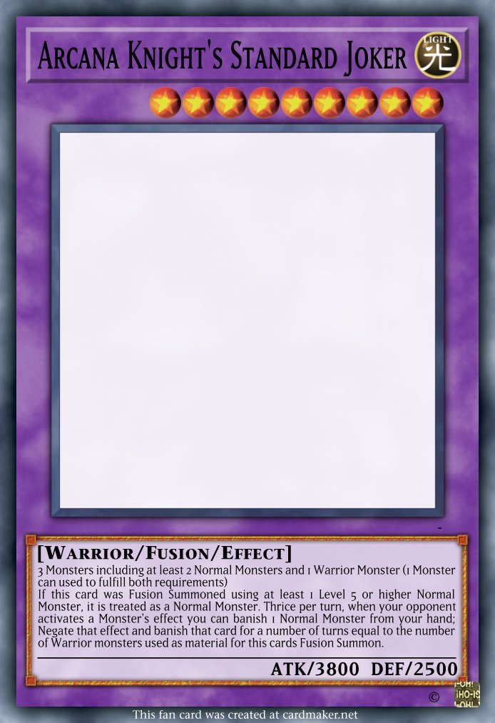 LazerSwordKirbo Posted April 29, 2024 Author Report Share Posted April 29, 2024 Another card for the Fusion Spell to summon, with a bit of poker knights support. Arcana Knight's Standard Joker LIGHT Level 9 Warrior/Fusion/Effect 3 Monsters including at least 2 Normal Monsters and 1 Warrior Monster (1 Monster can used to fulfill both requirements) If this card was Fusion Summoned using at least 1 Level 5 or higher Normal Monster, it is treated as a Normal Monster. Thrice per turn, when your opponent activates a Monster's effect you can banish 1 Normal Monster from your hand; Negate that effect and banish that card for a number of turns equal to the number of Warrior monsters used as material for this cards Fusion Summon. Link to comment Share on other sites More sharing options...