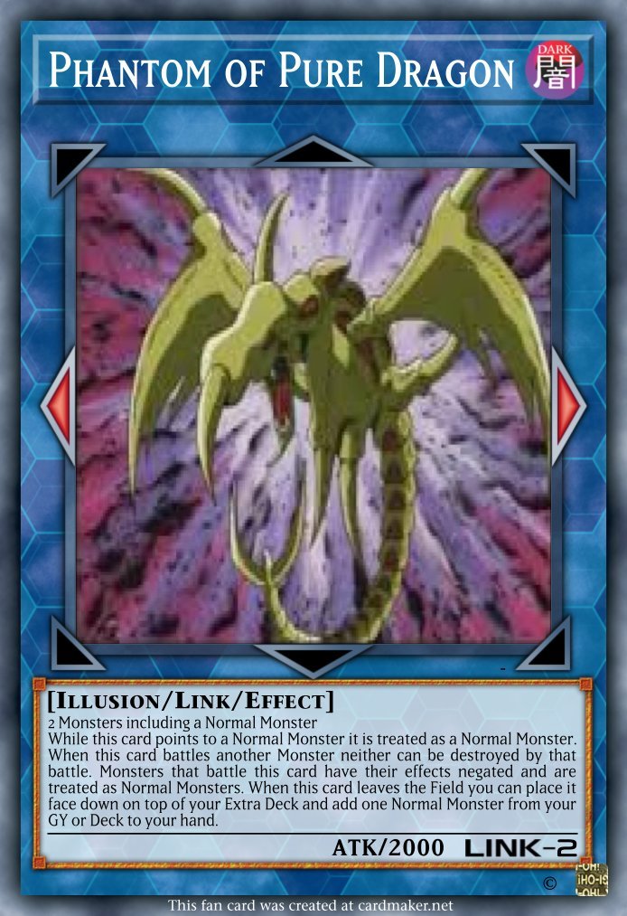 LazerSwordKirbo Posted May 1, 2024 Author Report Share Posted May 1, 2024 Been playing Chimera for the MD event so here is an Illusion Monster for the deck: Phantom of Pure Dragon DARK Link-2 left and right arrows Illusion/Link/Effect 2 Monsters including a Normal Monster While this card points to a Normal Monster it is treated as a Normal Monster. When this card battles another Monster neither can be destroyed by that battle. Monsters that battle this card have their effects negated and are treated as Normal Monsters. When this card leaves the Field you can place it face down on top of your Extra Deck and add one Normal Monster from your GY or Deck to your hand. Link to comment Share on other sites More sharing options...