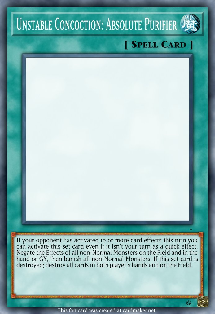 LazerSwordKirbo Posted May 2, 2024 Author Report Share Posted May 2, 2024 New board wipe card. It's more intended for general use but still fits in the sudo-archetype. Unstable Concoction: Absolute Purifier Spell If your opponent has activated 10 or more card effects this turn you can activate this set card even if it isn't your turn as a quick effect. Negate the Effects of all non-Normal Monsters on the Field and in the hand or GY, then banish all non-Normal Monsters. If this set card is destroyed; destroy all cards in both player's hands and on the Field. Link to comment Share on other sites More sharing options...