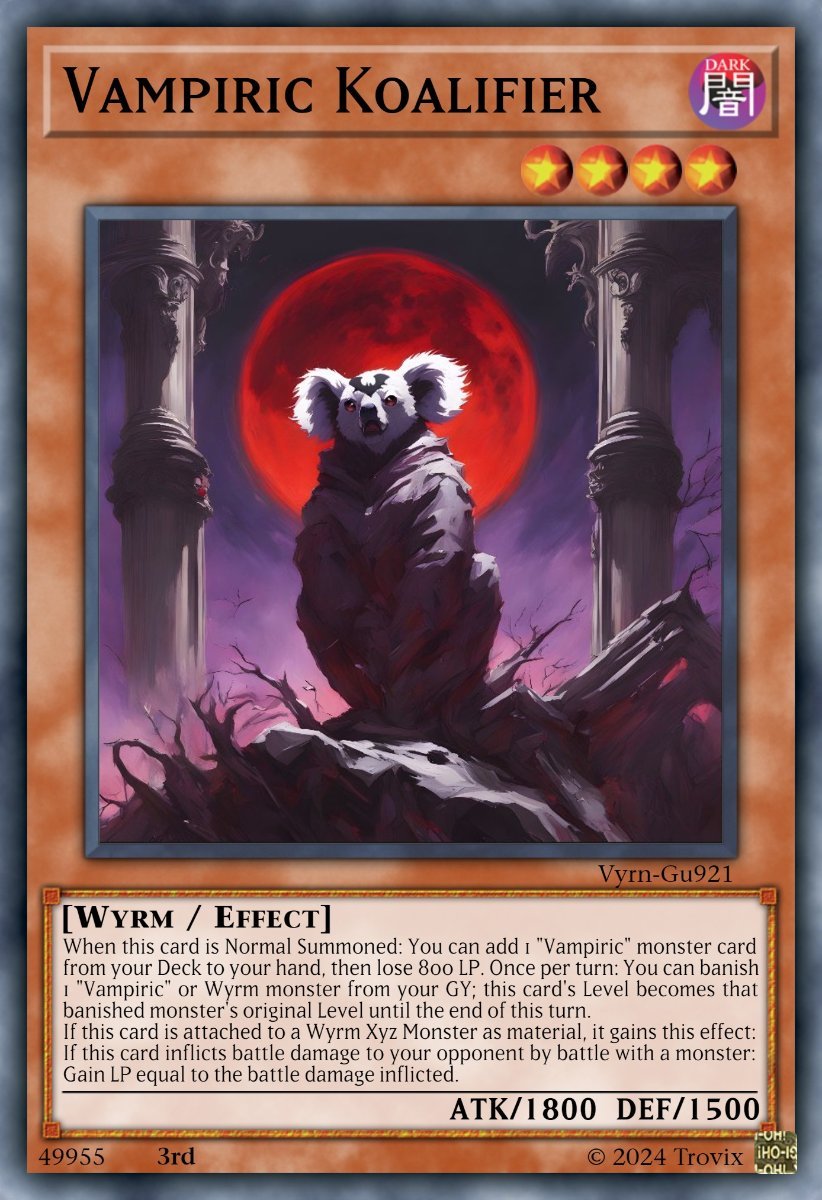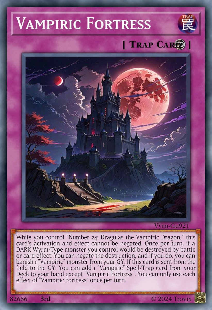 Yuma Kaiba Posted May 5, 2024 Report Share Posted May 5, 2024 Cool artwork. I think is too dependent on the "Vampiric Dragulas Disciple". For archetypes with level 6, this is less flexible. Need something like this, "You can Normal Summon this card without Tributing, but its original ATK becomes 500", "send 1 "Vampiric" monster from Deck, then Special Summon this card", "When this card is Normal or Special Summon, you can Special Summon 1 "Vampiric" monster from.." Link to comment Share on other sites More sharing options...