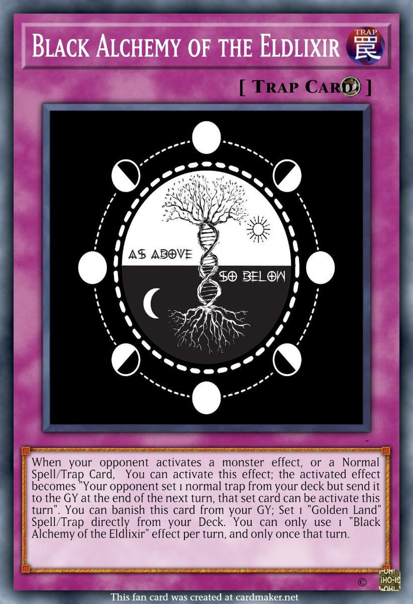 Nocromontodos Posted June 10, 2024 Report Share Posted June 10, 2024 When your opponent activates a monster effect, or a Normal Spell/Trap Card, You can activate this effect; the activated effect becomes "Your opponent set 1 normal trap from your deck but send it to the GY at the end of the next turn, that set card can be activate this turn". You can banish this card from your GY; Set 1 "Golden Land" Spell/Trap directly from your Deck. You can only use 1 "Black Alchemy of the Eldlixir" effect per turn, and only once that turn. Special Summon this card as a Normal Monster (Zombie/LIGHT/Level 1/ATK 2500/DEF 800) (this card is also still a Trap), then, if you control "Eldlich the Golden Lord", Activate 1 of these effects; ● Fusion summoned 1 monster from your Extra Deck, using this card, and 1 zombie monster from your deck or field as material. ● Special Summon 1 Zombie monster from your Deck or GY. During the End Phase: You can banish this card from your GY; Set 1 "Eldlixir" Spell/Trap directly from your Deck. You can only use 1 "Tree of the Golden Land" effect per turn, and only once that turn. "2 different names zombie monsters" If this card is Special Summoned: You can Set 1 "Eldlixir" or "Golden Land" card from your deck. Twice per turn: if the "Eldlixir" or "Golden Land" card is Banished, you can shuffle that banished card to the deck, then set 1 non "Eldlixir" or "Golden Land" normal trap from your deck. Once per turn, if this card leaves the field: you can special summon "Eldlich the Mad Golden Lord" from your extra deck and ignore its summon condition. "Eldlich the Mad Golden Lord" gain this effect for the rest of the duel if special summon this way: ● (Once per turn) If this card is in your GY: You can shuffle 1 "Eldlixir", "Golden land" or 1 normal trap card that was Banished, in your Hand or Field to the deck, special summon this card. (This card is always treated as "Eldlich the Golden Lord") Link to comment Share on other sites More sharing options...