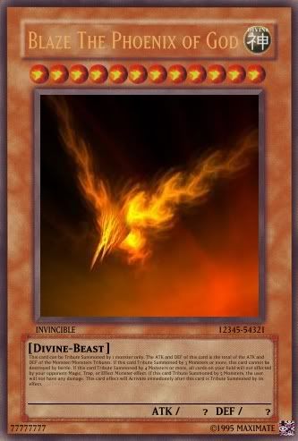 Seta Posted May 29, 2008 Report Share Posted May 29, 2008 OK! Here are the semi cards!I do not own the artwork.EDIT:EFFECT: When this card attacks, draw 1 card and reveal it. Aplly the effect depending on the card type:- Spell: During the end of this turn, return this card to your hand to increase your Life Points by 1000.- Monster: Negate the attack of this card and return it back to your hand. Then choose 1 monster on your side of the field. The chosen monster can attack twice during this turn only.- Trap: Return this card and 1 Face-Up monster from your side of the field to your hand to destroy 3 cards on the field.When this card is in your hand, by discarding this card to your Graveyard, you may Special Summon 1 "Cyber Mecha Robot" from your hand, deck or Graveryard. Okay! I should now be allright to the semis! Link to comment Share on other sites More sharing options...