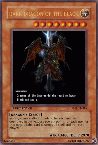 Randomdog Posted May 29, 2008 Author Report Share Posted May 29, 2008 Here is my card:I expect relatively high marks' date=' because:- It's be balanced, and the OCG seems fine. (effect)- I actually made the art myself, and it looks like a dark version.- It's compatible with other dark monsters and Foolish Burial.[/quote'] I'll tell you what you can "except" to get when i mark it Link to comment Share on other sites More sharing options...
