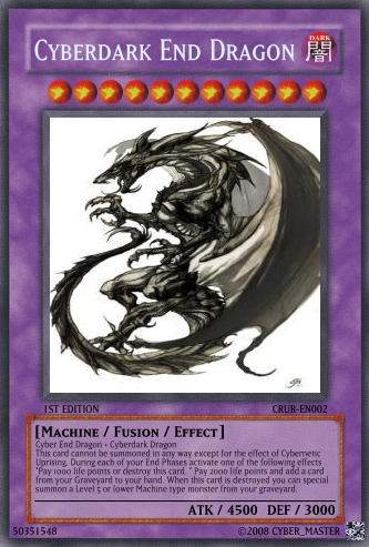♫Griffinsusername♫ Posted May 26, 2008 Report Share Posted May 26, 2008 some OCG problems and a more balanced (and OCG friendly) effect is:"This card can only be Special Summoned by the effect of "Cybernetic Uprising." During each of your End Phases, you can activate one of the following effects. If you do not this card is destroyed: Pay 1000 Life Points to add 1 card from your Deck or Graveyard to your hand, pay 500 Life Points. When this card is destroyed and sent to the Graveyard, add one level 5 or lower Machine-type monster from your Graveyard to your hand." other than that, good idea! Link to comment Share on other sites More sharing options...