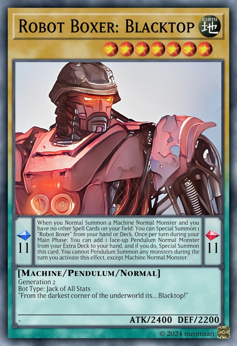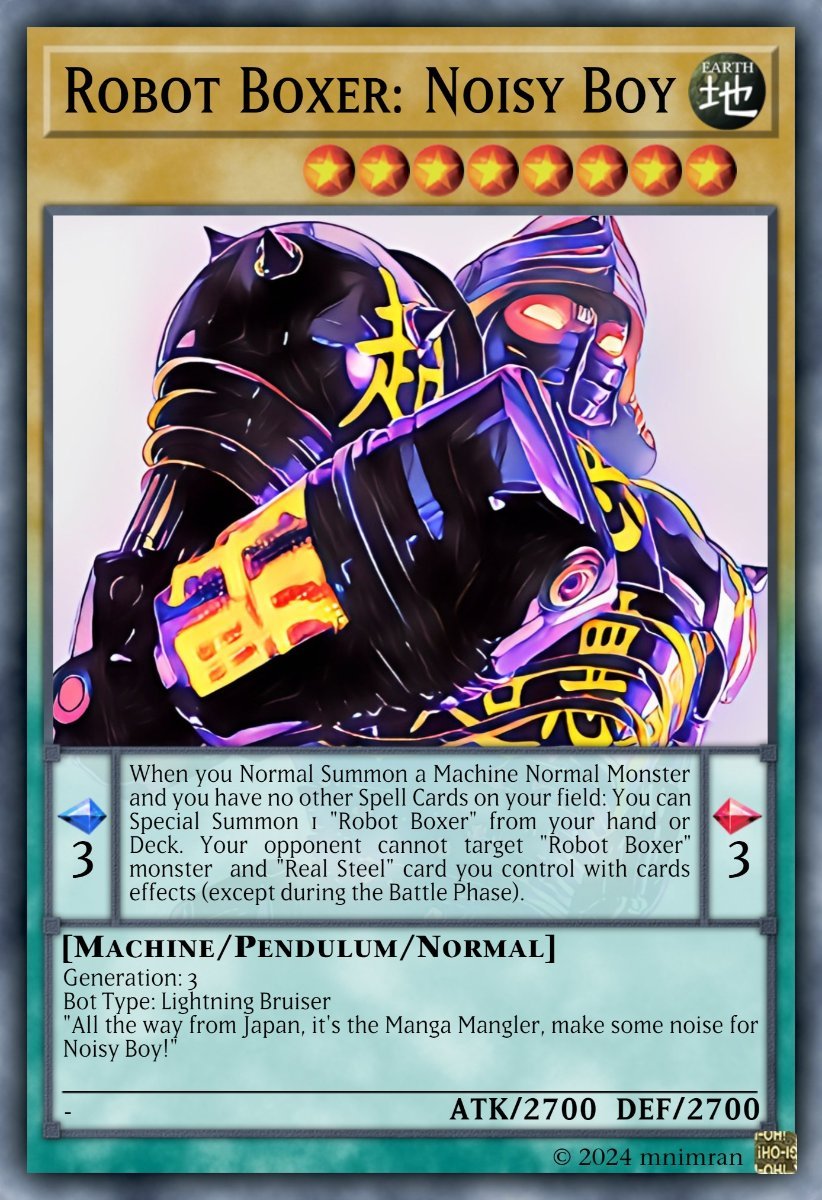 Tania Tongeng Posted August 14, 2024 Report Share Posted August 14, 2024 (edited) ================== ROBOT BOXER ARCHETYPE ================== Hello, I just wanted to share my version of the collaboration between Yu-Gi-Oh! and Real Steel (2011 movie): Robot Boxer Archetype. My previous post: J.P. DINOSAUR ARCHETYPE (JURASSIC PARK) SAURON'S ARMY ARCHETYPE (THE LORD OF THE RINGS) JAEGER ARCHETYPE (PACIFIC RIM) XENOMORPH-YAUTJA (ALIEN VS PREDATOR) SLASHER ARCHETYPE (SLASHER FILMS) MARVEL HERO ARCHETYPE (MCU) POKEMON ARCHETYPE (POKEMON) ARACHNID ARCHETYPE (STARSHIP TROOPERS) SPONGEBOB (SPONGEBOB SQUAREPANTS) SINISTER SIX ARCHETYPE (SPIDER-MAN) AIRBENDER ARCHETYPE (AVATAR THE LAST AIRBENDER) Robot Boxer Monster has level 7 to 10, so to support a Deck with this archetype, you can use existing Machine Normal Monster Level 1 to 4 (eg. Overdrive or Gradius), because Robot Boxer monster has a pendulum effect that can Special Summon Robot Boxer from Deck or Hand if the Player Normal Summon Machine Normal Monster. In addition to existing Machine Normal Monsters, Robot Boxer/Real Steel Deck can be supported by cards that provide support to Normal Monsters such as: - Skill Drain - Heart of the Underdog - Ancient Rules - Summoner's Art - Cry Havoc! - Tyrant's Throes - Fists of the Unrivaled Tenyi - Flawless Perfection of the Tenyi - White Elephant's Gift - Common Charity - Heat Wave - Summoner's Art - Dragon Horn Hunter - First of the Dragons - etc. To support Pendulum Summon, this archetype is equipped with two link monsters that can be summoned using Normal Monsters (including Normal Monsters on the opponent's field), so that the pendulum summon from the Extra Deck can be more than one. If the opponent does not have a Normal Monster, the effect monster can be changed through "System Failure" and the effect of the golden touch of "Midas". Monster: Black Thunder, the 1-Ton Bull Robot Boxer: Ambush Robot Boxer: Noisy Boy Robot Boxer: Midas Robot Boxer: Atom Robot Boxer: Metro Robot Boxer: Blacktop Robot Boxer: Six Shooter Robot Boxer: Blac Jac Robot Boxer: Twin Cities Robot Boxer: Zeus SPELL: Real Steel WRB (Field) System Failure (Quick) Robot Repairing Shop TRAP: Real Steel Champion Real Steel Spirit Steel Uppercut The Corner EXTRA DECK: Robot Boxer: Danger Zone (Link 2) Robot Boxer: Albino (Link 3) Edited November 25 by Tania Tongeng Quote Link to comment Share on other sites More sharing options...