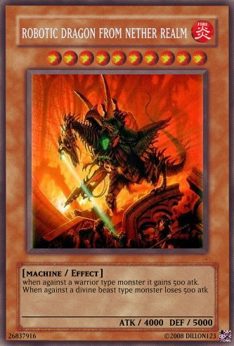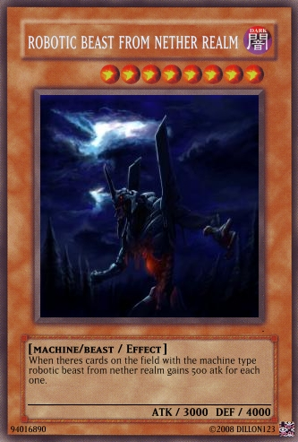 Gogeta™ Posted June 3, 2008 Report Share Posted June 3, 2008 Theres some OCG errors in the text. The 1st letters of the words need tobe capitalized. Also a monster can only have one Type, unless you make the card have the effect of changing it's Type. Robotic Dragon from the Nether Realm: When this card attacks a Warrior-Type monster increase the ATK of this card by 500 points. When this card attacks a Divine Beast-Type monster decrease the ATK of this card by 500 points. Robotic Beast from the Nether Realm: Increase the ATK of this card by 500 points for every Machine-Type monster on the field. I fixed the cards up 4 ya. Make these changes and the cards will b good. 8/10.:D Link to comment Share on other sites More sharing options...