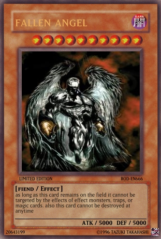 Senbanzakura Posted June 13, 2008 Report Share Posted June 13, 2008 Fix the first cards name. It should be Fallen Angel, not Fallen Angel- not big deal.2nd card......Someone was bored O.o i don't like it at all. 1st card. 7/102nd card. 2/10 Just me. Your getting there Link to comment Share on other sites More sharing options...