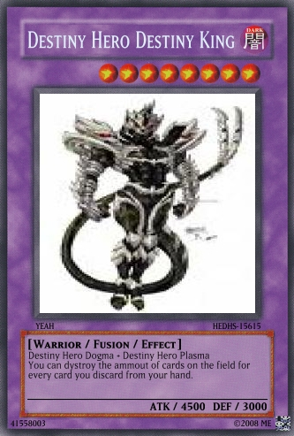 Blue Lightning Posted June 13, 2008 Report Share Posted June 13, 2008 Absolutely horrible. The picture needs to be changed' date=' You need to use [img'] tags, The OCG is bad, and a fusion of Plasma and Dogma already exists. This card's score: 2/10 Well, a fusion of E Hero Burstinatrix and Avian already existed when they made phoenix enforcer soooooooo. Anyways I just saw the picture a few minutes ago and you have to work on the OCG. Nice concept though. Also the name sounds kind of funny Link to comment Share on other sites More sharing options...