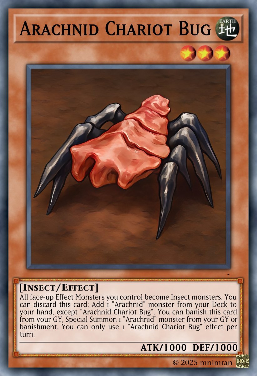 Tania Tongeng Posted May 15 Report Share Posted May 15 (edited) ================ ARACHNID ARCHETYPE ================ Welcome to the 9th YU-GI-OH! COLLABORATION SERIES. The archetype this time is the giant insect-like alien race called "Arachnids" from the legendary movie: "Starship Troopers". The goal of this "Arachnid" Deck is to invade the opponent's field with "Arachnid" monsters to restrict the opponent's movement, then deal damage from effects (burn). Would you like to know MORE? My previous post: J.P. DINOSAUR ARCHETYPE (JURASSIC PARK) SAURONS ARMY (THE LORD OF THE RINGS) XENOMORPH-YAUTJA ARCHETYPE (ALIEN VS PREDATOR) ROBOT BOXER ARCHETYPE (REAL STEEL) JAEGER-KAIJU ARCHETYPE (PACIFIC RIM) SLASHER ARCHETYPE (SLASHER FILMS) MARVEL HERO ARCHETYPE (MCU) POKEMON ARCHETYPE (POKEMON) SPONGEBOB (SPONGEBOB SQUAREPANTS) SINISTER SIX ARCHETYPE (SPIDER-MAN) AIRBENDER ARCHETYPE (AVATAR THE LAST AIRBENDER) Edited November 25 by Tania Tongeng Quote Link to comment Share on other sites More sharing options...