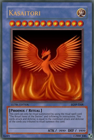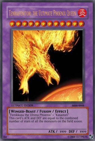 N00B Hunter Posted June 17, 2008 Report Share Posted June 17, 2008 The cards are pretty terribly overpowered... the first wipes the entire field (aside from itself) like Daedalus with easy conditions, while the ritual cards have bad Ritual text, and the mosnter is overpowered. Your Fusion is able to be created with substitute monsters, and is incredibly overpowered... None of these cards really deserve compliments. Unorigninality (Phoenix cards have been made before, believe it or not) and overpoweredness (such incredible aggro and field control powers!!!) are your main problems, keeping this card from being TCG-worthy. You should cool down; try to make some 4-stars [and below] and some less-intense Spell Cards... start with the cards that are easy to balance before runnning full throttle. Link to comment Share on other sites More sharing options...