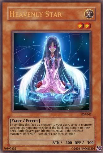 nagolkid2 Posted June 18, 2008 Report Share Posted June 18, 2008 hello, here are some new cards i made.....plaese rate and enjoy! http://i95.photobucket.com/albums/l134/nagolkid2/star-1.jpg[/img]nagolkid2/rush.jpg[/img] Effect:When a Plant type monster on your side of the field is destroyed by a card effect, you can pay 1000 life points to summon this card from your hand.During your end phase during a turn when this card did not attack, you can remove from play 1 Plant type monsterin your graveyard. For each removed from play plant type monster this card gains effects ( the effects do not accumulate).1 : This card gains 500 attack points.2 : This card can attack twice during the battle phase.3 : Increase the attack of all plant type monsters under your control by 500 points.4 : when this card attacks you can special summon 1 Plant type monster from your graveyard with less than 6 stars.5 : summon 1 "Sheild Spirit Of The Forest" From your hand, ignoring the summoning conditions. Effect : When a Plant type monster on your side of the field is destroyed by a card effect, you can pay 1000 life points to summon this card from your hand. During your opponents end phase during a turn when this card was not attacked, you can remove from play 1 Plant type monsterin your graveyard. For each removed from play plant type monster this card gains effects ( the effects do not accumulate).1 : This card gains 500 Defence points.2 : This card is not destroyed by the effects of spell cards.3 : Increase the Defence of all plant type monsters under your control by 500 points.4 : when this card is attacked you can special summon 1 Plant type monster from your graveyard with less than 6 stars.5 : summon 1 "Sword Spirit Of The Forest" From your hand, ignoring the summoning conditions. Link to comment Share on other sites More sharing options...