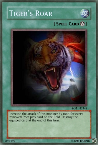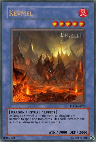 ShadowKyogre Posted June 19, 2008 Report Share Posted June 19, 2008 Kevmel itself is OP because of its level (6, it should be 10). Also, rewrite it to be a bit more sounding like this: As long as this card is on the field, all Dragon-type monsters are unaffected by Spells and Traps and gain 500 ATK. Kevmel's ritual should state that you need to Tribute monsters whose levels equal to or lower than Kevmel's, or make it a normal spell and Kevmel an effect monster. And Tiger's Roar should be a normal spell and state "Select 1 monster. Increase the selected monster's ATK by (more reasonable) * the number of cards removed from play. At the End Phase of the turn this card was activated, destroy the monster affected by this effect." Link to comment Share on other sites More sharing options...