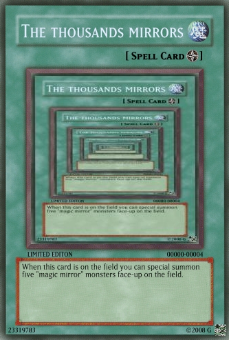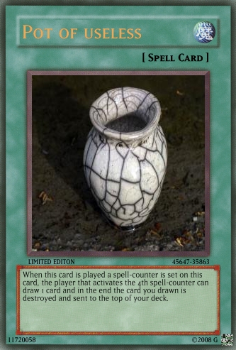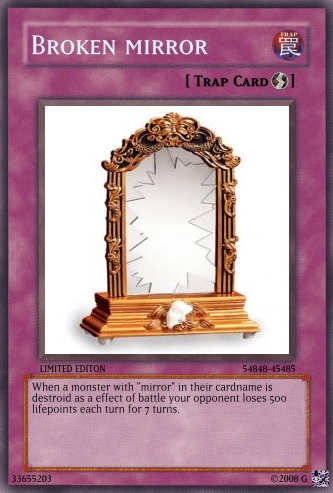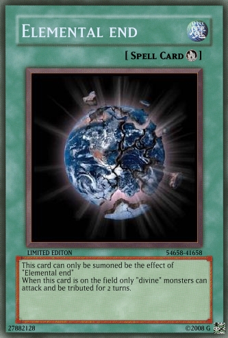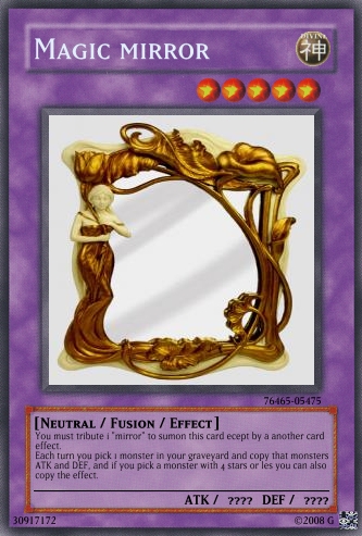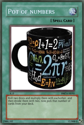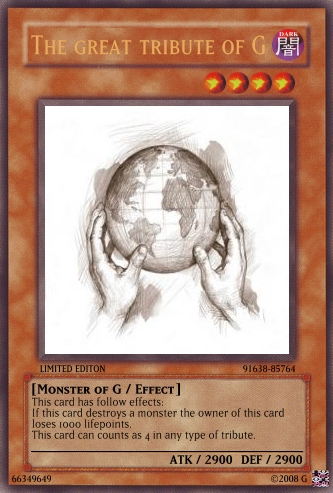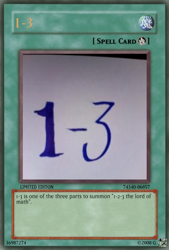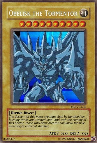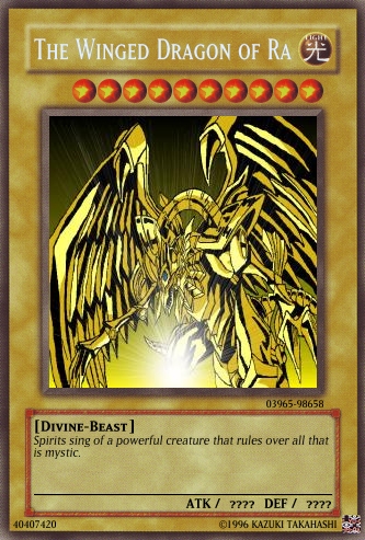 Judαs Posted June 22, 2008 Report Share Posted June 22, 2008 The cards are still a bit overpowered, and you really need to work on OCG. Look in the tutorials section for help and Yu-Gi-Oh! Wikia for seeing the card text on real cards.And don't use attachments, do this:When your card is created, click on the picture.Wait till a code appears in place of Uploading to Imageshack...Copy the code that appears below the card.Paste it into your post. If [/img] is not at the end of the code, add it.Good luck at better cardmaking :) Link to comment Share on other sites More sharing options...