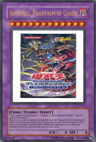 LiLJonJon94 Posted June 21, 2008 Report Share Posted June 21, 2008 This is the real future english version (except that the picture shown is the 10th Japanese Limited Edition Pack - Chaos Black.) I can't confirm the card details shown is completely accurate as japanese and english versions tend to differ. The number (bottom-left) is most definitely diffrent as they put diffrent numbers for diffrent regions. Thanks. Enjoy and comment :):):) Link to comment Share on other sites More sharing options...